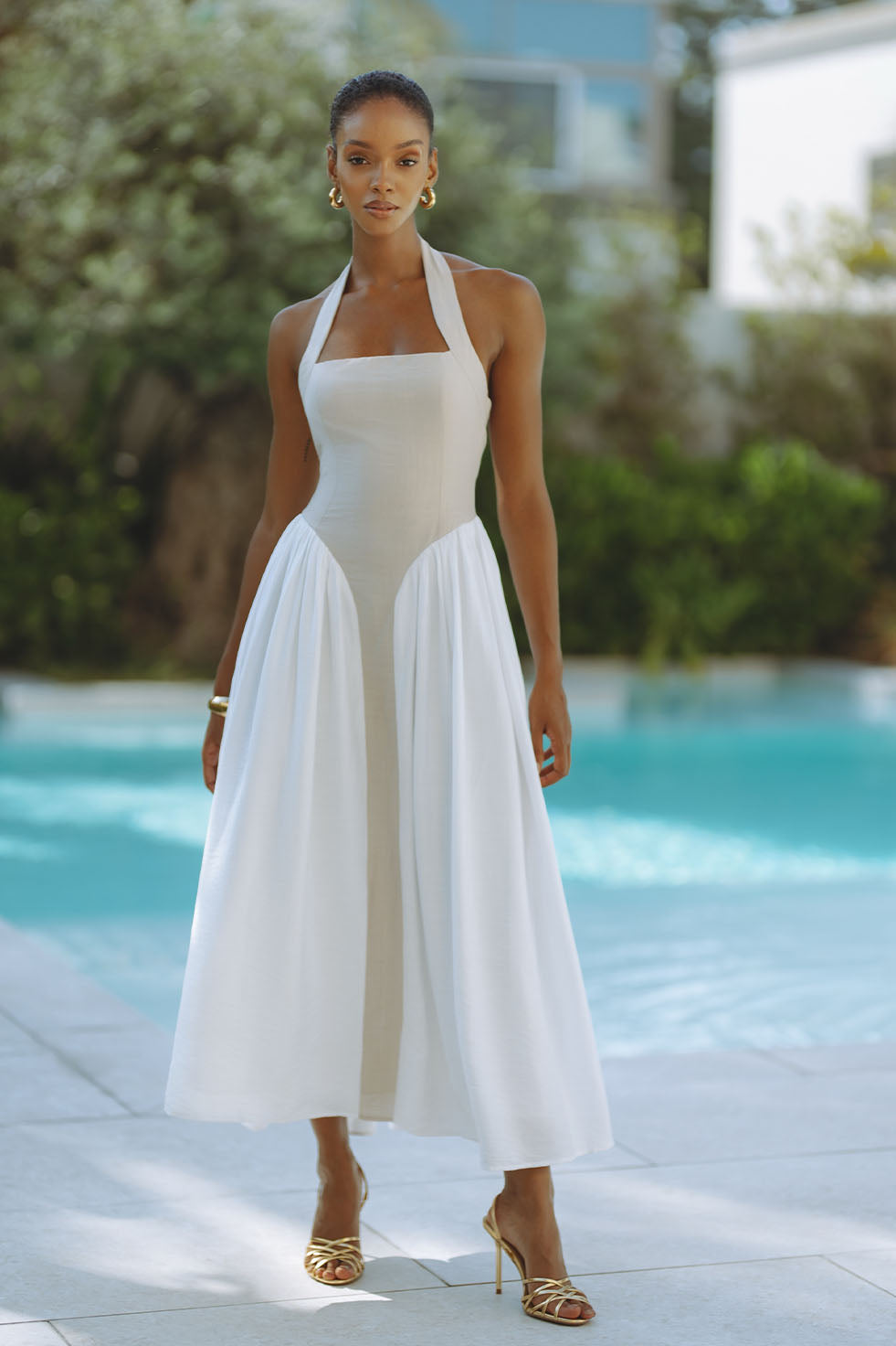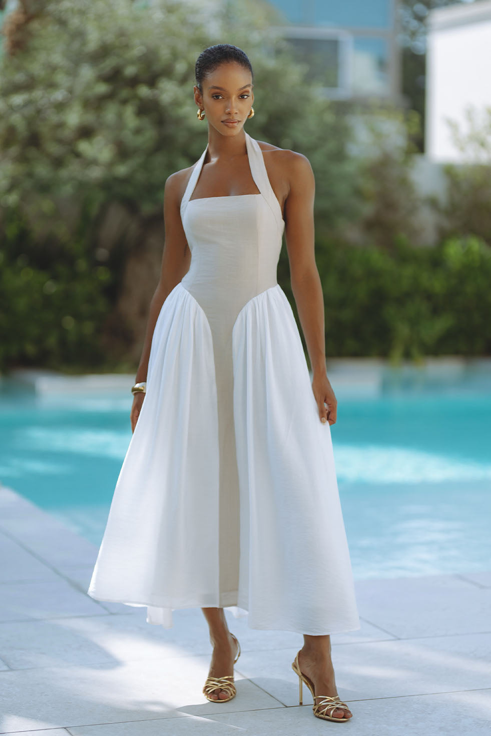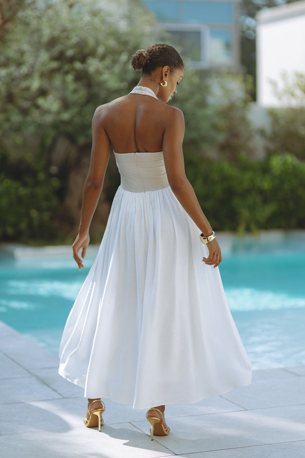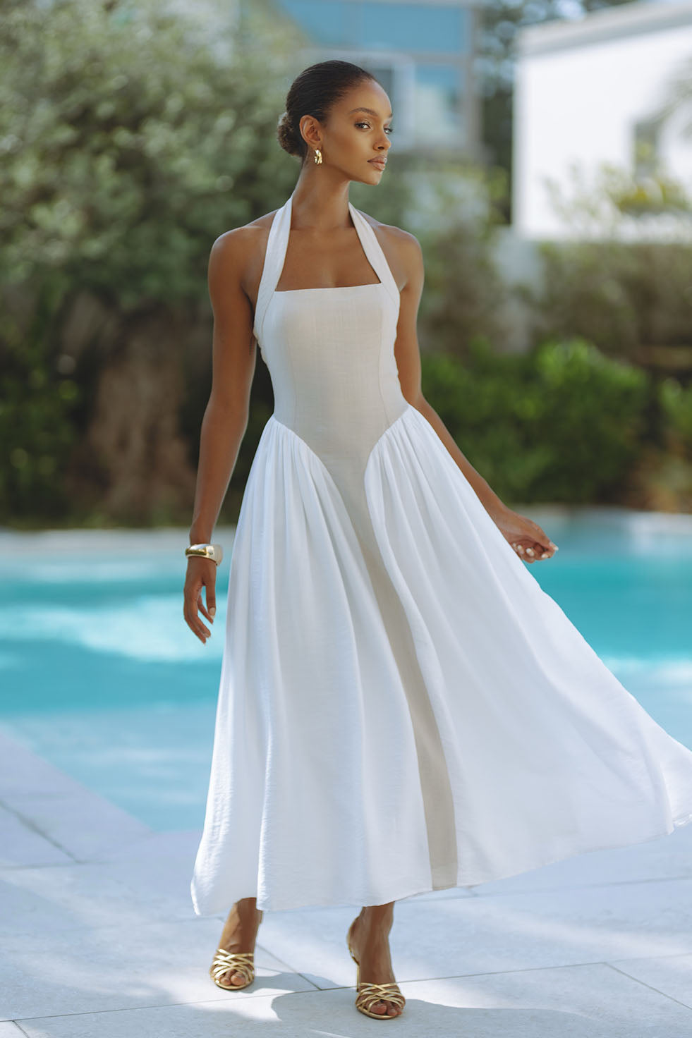 The Sammi Midi Dress in sand and white exudes understated elegance with a breezy, resort-ready charm. Crafted from a lightweight rayon blend, it features a halter neckline and structured sand-toned bodice that beautifully defines the waist. Flowing into a voluminous white midi skirt, its softly gathered panels create graceful movement with every step. Perfect for sunlit escapes and evening strolls, this dress balances refined tailoring with effortless femininity.