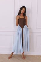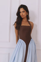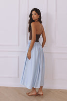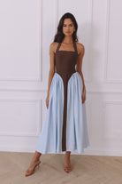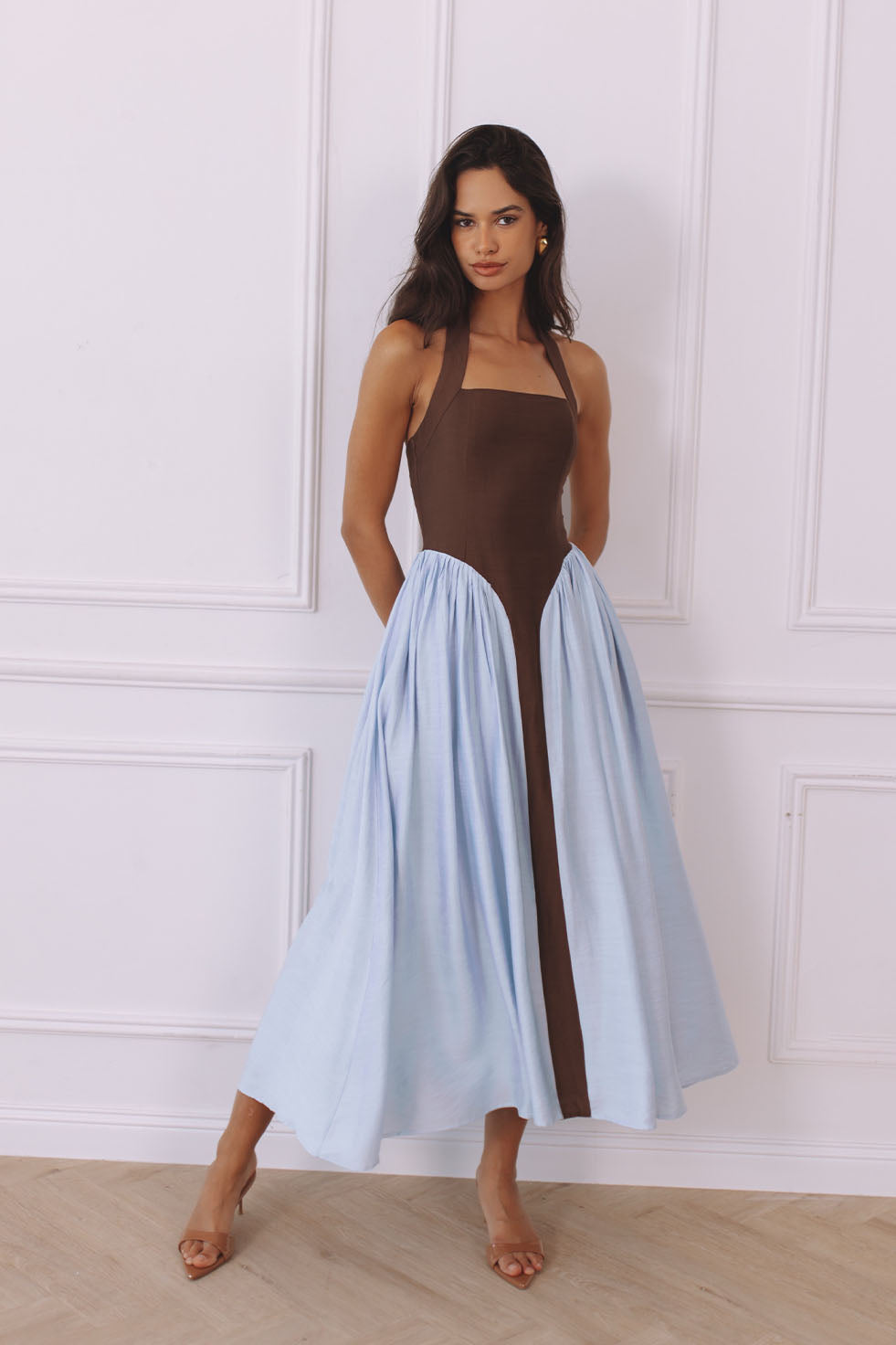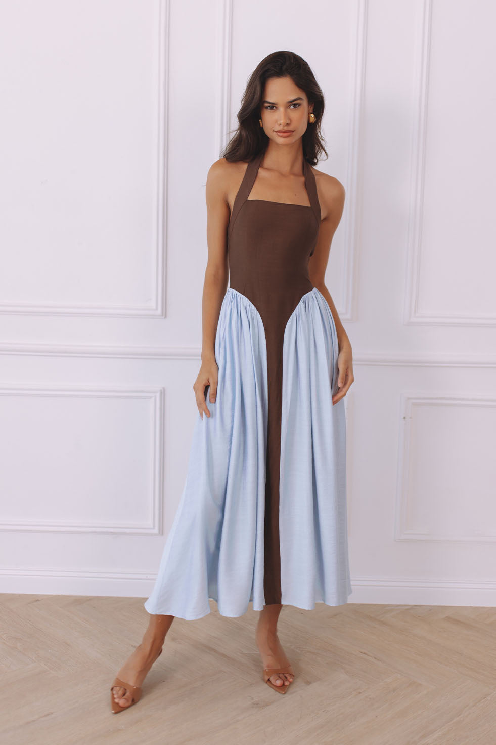 SAMMI HALTER MIDI DRESS - CHOCOLATE/SKY BLUE