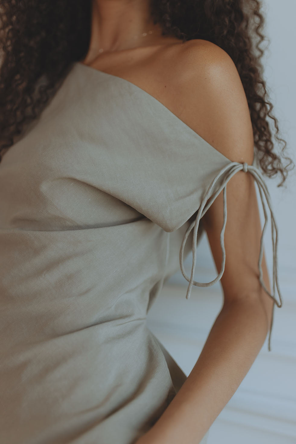 Effortlessly refined, the Darcy Top in sage is crafted from a soft viscose-linen blend that drapes beautifully while offering light structure. Designed with a one-shoulder neckline and adjustable tie detailing on the sleeve, it features a self-tie waist that can be fastened at the back for a cinched, feminine silhouette. A versatile summer staple that pairs perfectly with the Jessica Shorts in Sage for an elegant, coordinated look.