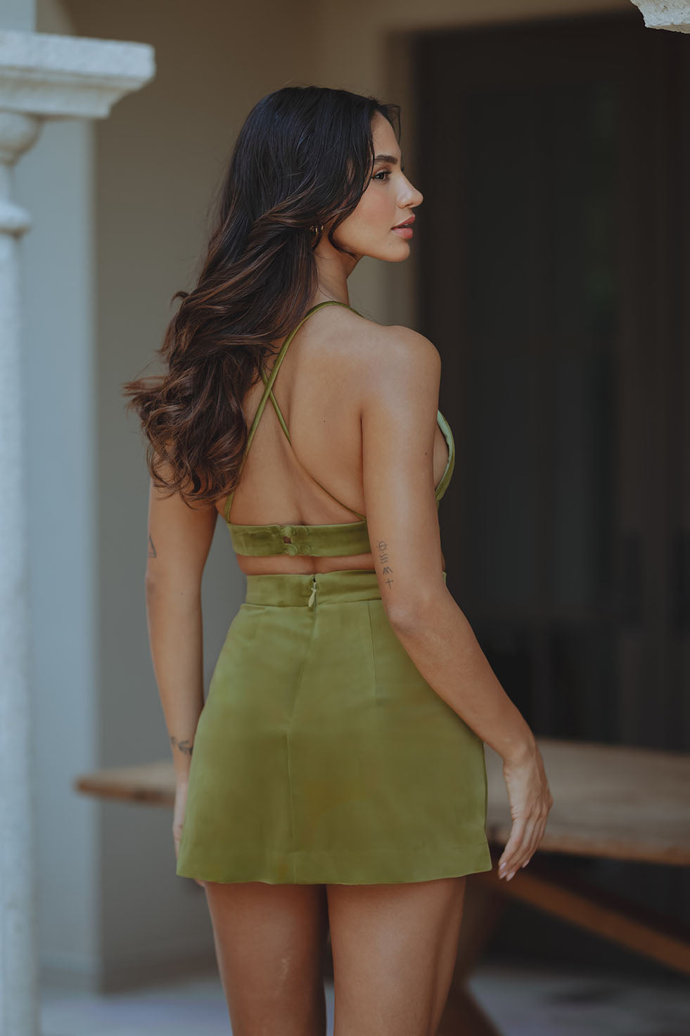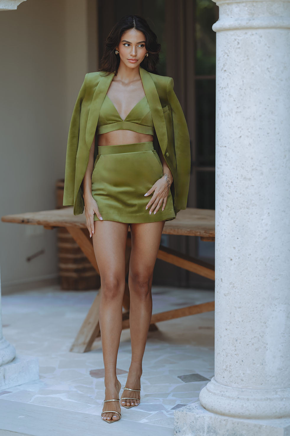 The Faye Velvet Top in moss green exudes refined elegance with a modern edge. This bralette-style top features a flattering deep V-neckline and sleek silhouette. Pair it with the matching Simone Velvet Skirt and blazer for a coordinated look that’s effortlessly chic and contemporary. Perfect for making a bold statement while staying comfortably stylish.