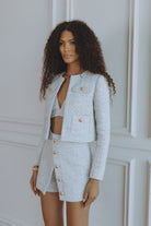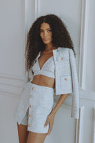 The Margaux Crop Jacket is a timeless statement in textured bouclé. Cut in a refined soft blue-grey hue, it features a structured silhouette with gold embossed buttons and front flap pockets. The cropped length pairs effortlessly with high-waisted pieces, creating a polished and modern look. Complete the set with the matching Margaux Bralette and Skort for an elevated co-ord moment that transitions seamlessly from day to evening.