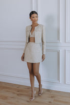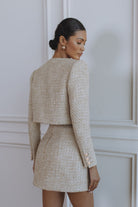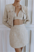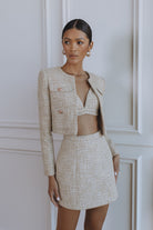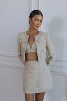 Chic, structured, and endlessly versatile, the Margaux Bouclé Hourglass Mini Skirt is crafted to flatter with a refined, sculpted silhouette. Made from textured light-gold bouclé with a subtle shimmer, this mini skirt sits high on the waist to accentuate the curves while maintaining a polished, tailored finish.