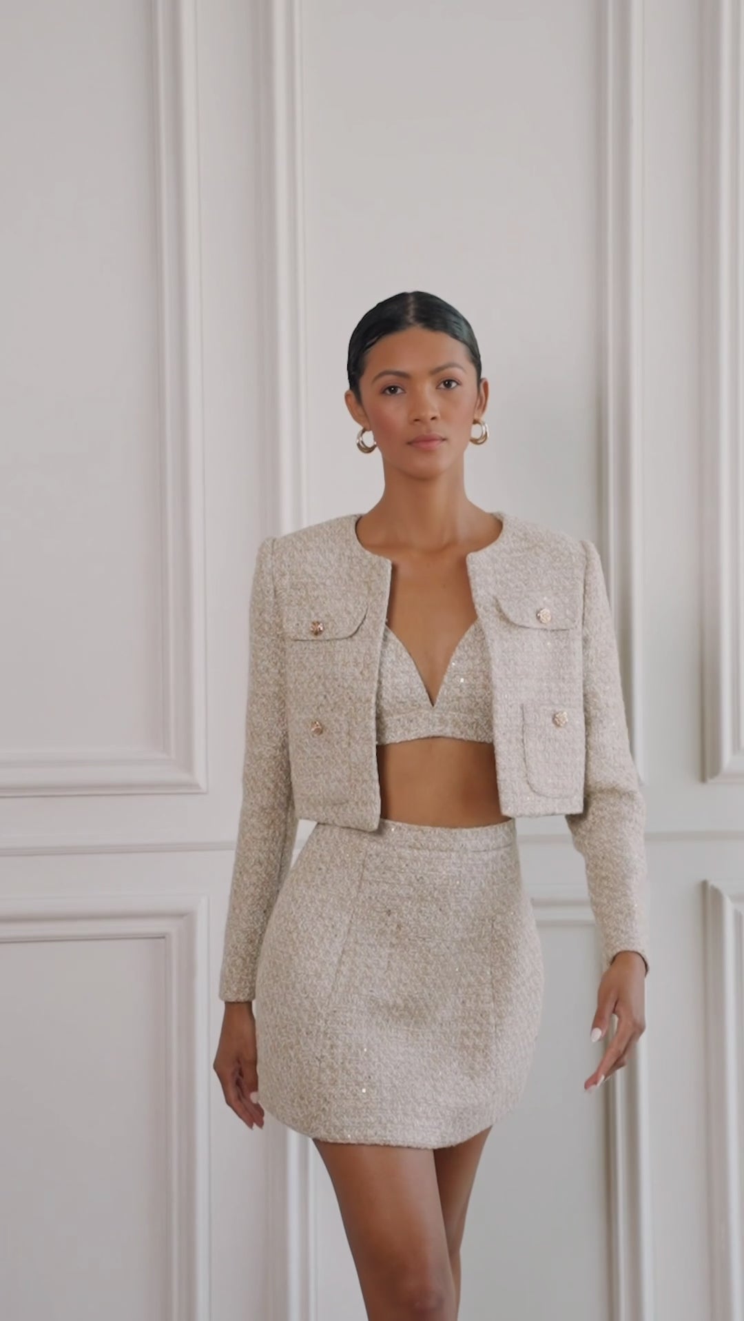 Designed to pair seamlessly with the matching Margaux Bouclé Jacket and Bralette, it also styles beautifully with crisp shirts or sleek knit tops for elevated day-to-night dressing. Finished with a concealed back zip for a smooth, streamlined fit.