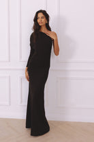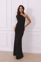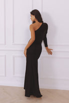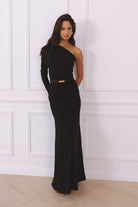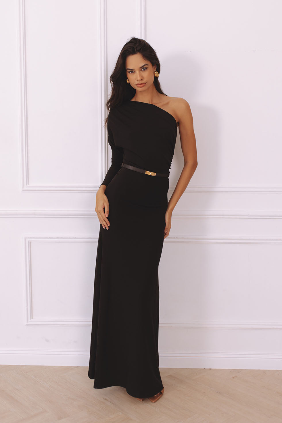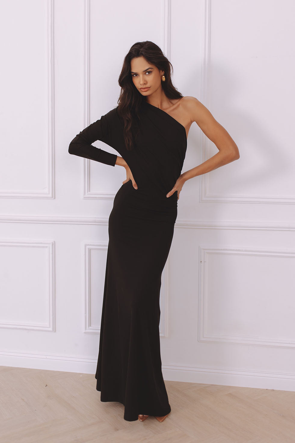 Timeless and refined, the Sabine Jersey Maxi Dress in black is a modern statement of sophistication. Crafted from our signature soft stretch jersey, it features a one-shoulder silhouette with gentle draping and a fluid, body-skimming fit. Two adjustable strings at each side tie elegantly at the back, creating a cinched waist that defines the figure while maintaining effortless comfort. The classic black tone makes Sabine a versatile piece for any occasion, day or night.