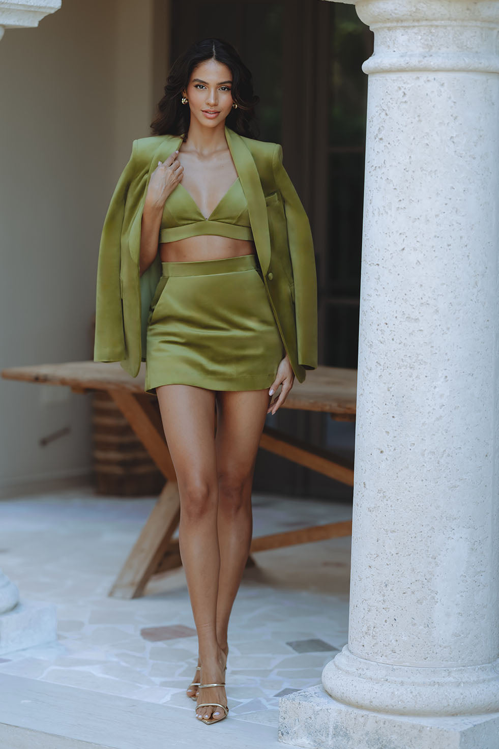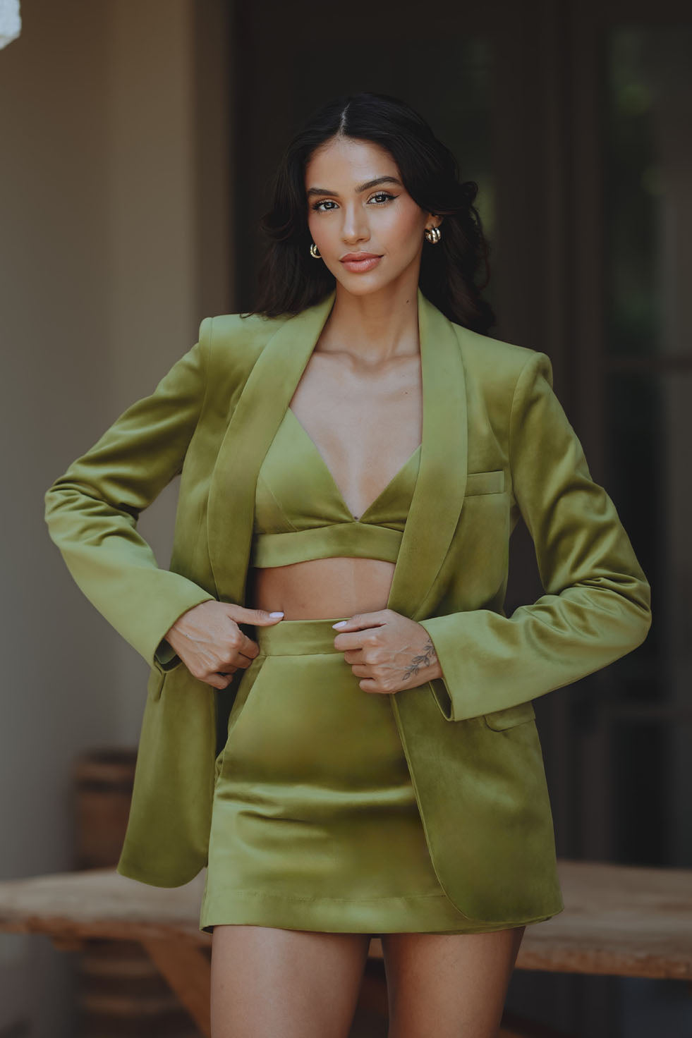 The Simone Velvet Blazer in moss green is a sophisticated statement piece. With a structured silhouette and a single-button closure, this blazer brings an elevated touch to any look. Pair it with the matching bralette and mini skirt for a coordinated, chic ensemble that transitions seamlessly from day to night.