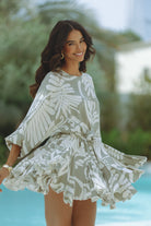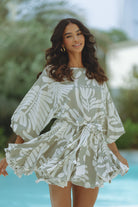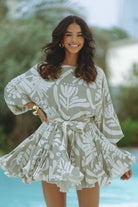 Effortlessly breezy and endlessly flattering, the Zilpah Mini Dress in Tropica Mono is a vacation dream. Made from airy, lightweight fabric, it features voluminous sleeves, a cinched waist tie, and a flared, pleated hem that moves with you. The tropical abstract print in soft neutrals brings a fresh, modern edge—perfect for resort strolls or barefoot brunches by the sea.