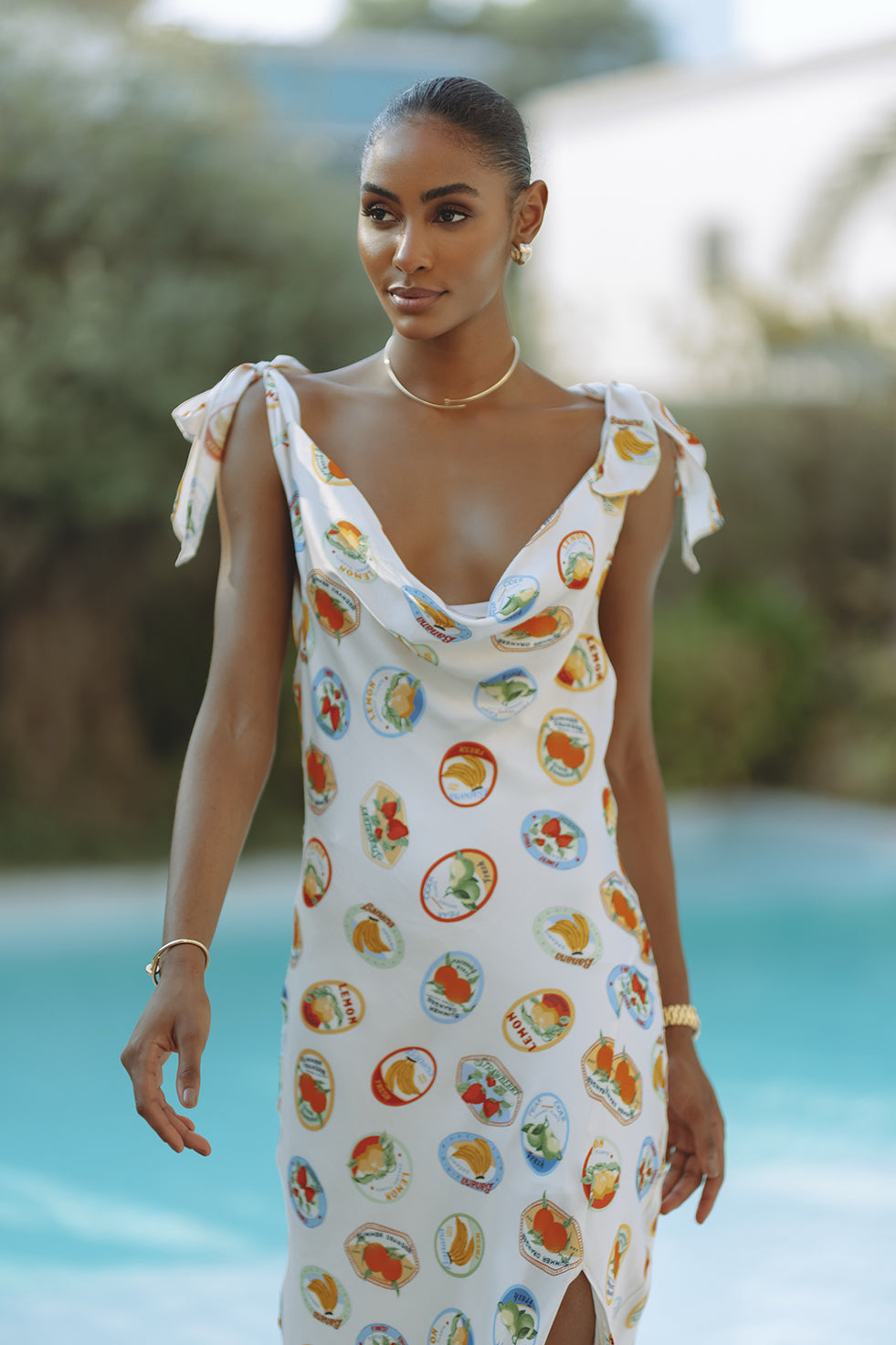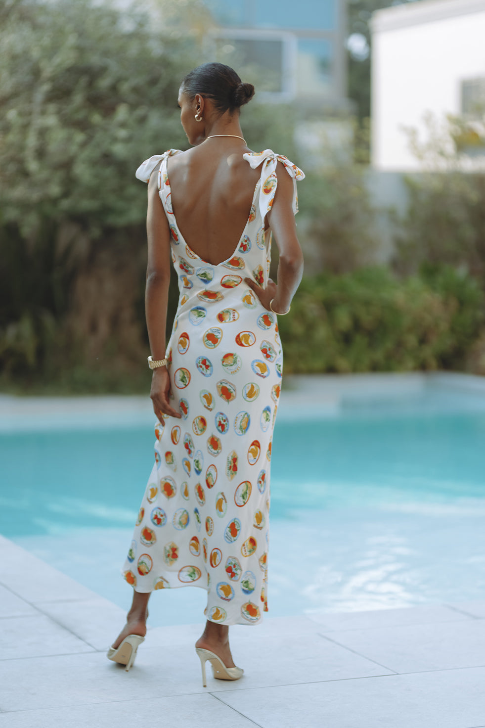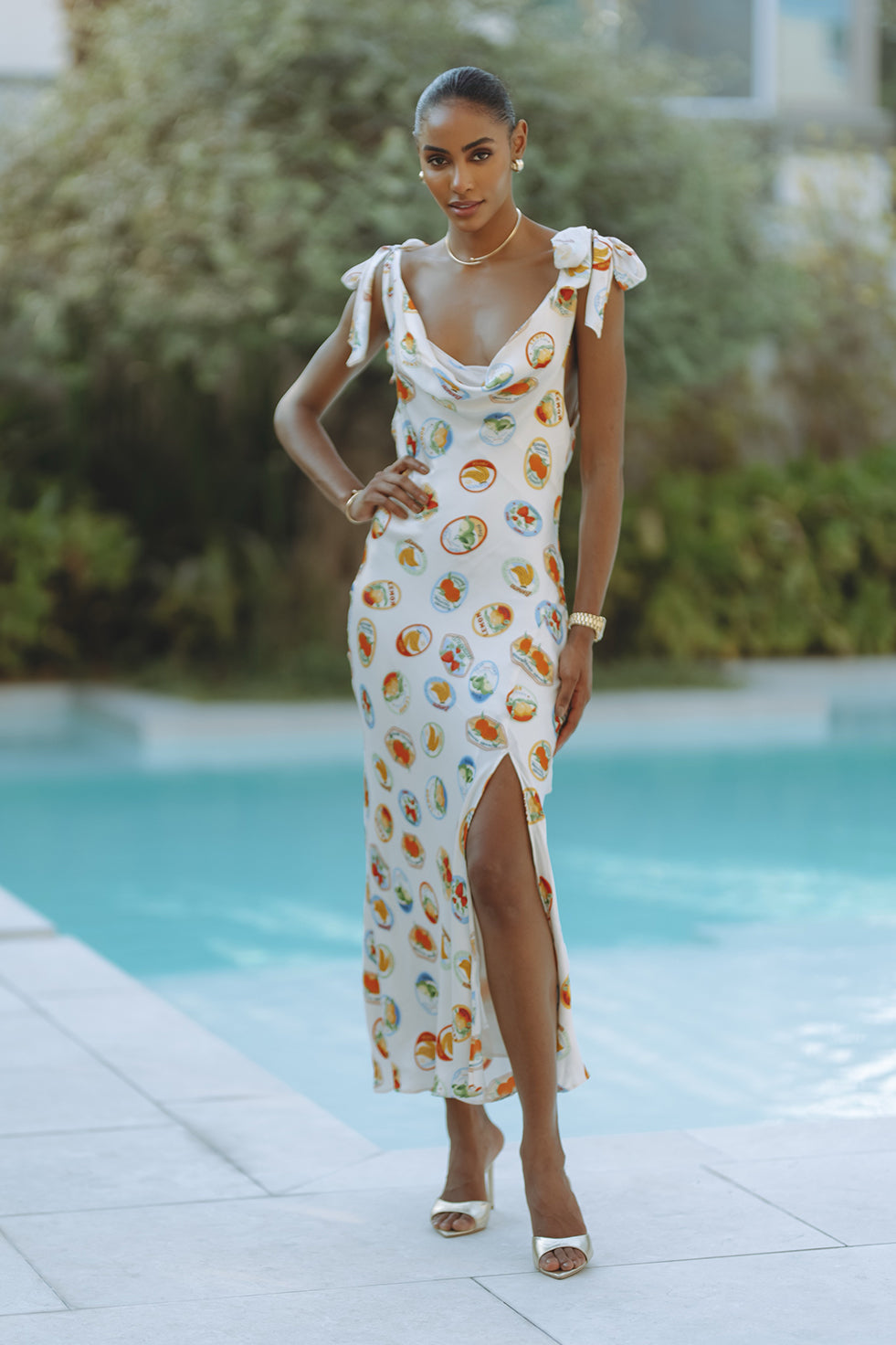 ALLEXINA SATIN COWL NECK MIDI DRESS - IVORY FRUIT COCKTAIL