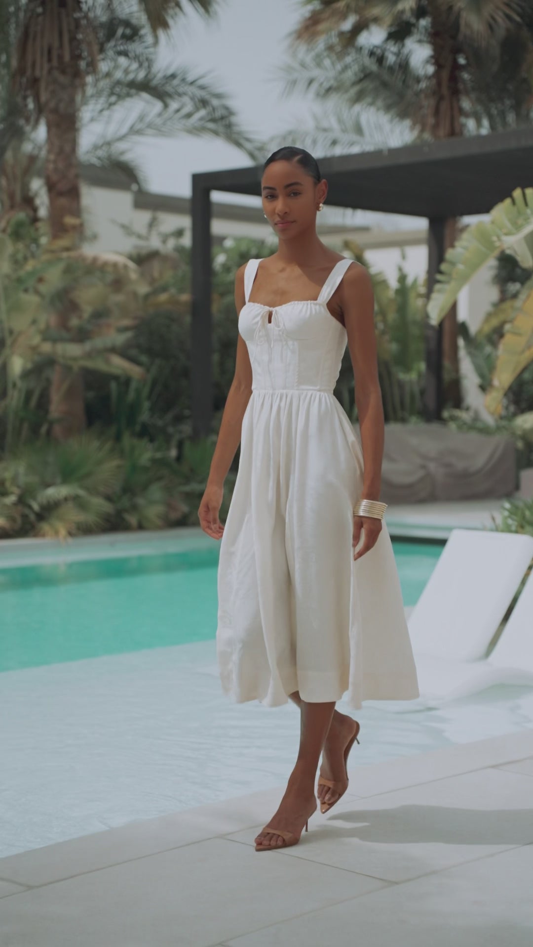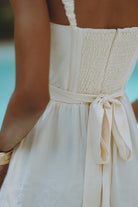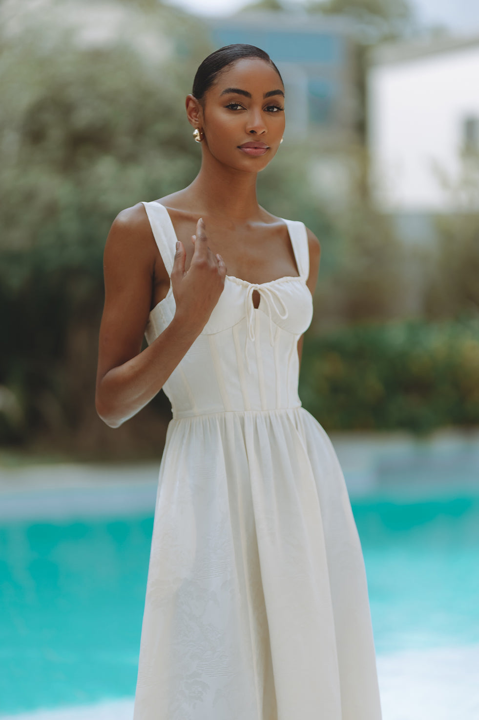 Graceful and refined, the Sancia Corset Midi Dress is cut from luxurious ivory jacquard with a subtle textured sheen. Featuring a structured corset bodice with a delicate tie-front detail, wide straps, and a flattering A-line silhouette, it blends elegance with ease. The smocked back ensures a comfortable fit, while a waist tie enhances feminine shape. Perfect for bridal showers, garden soirées, or romantic evenings, this timeless midi exudes effortless sophistication.