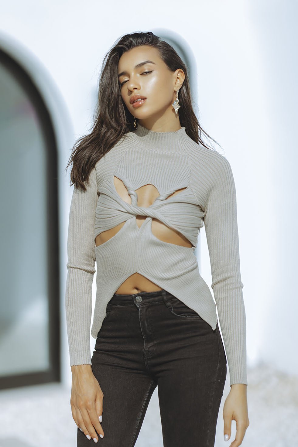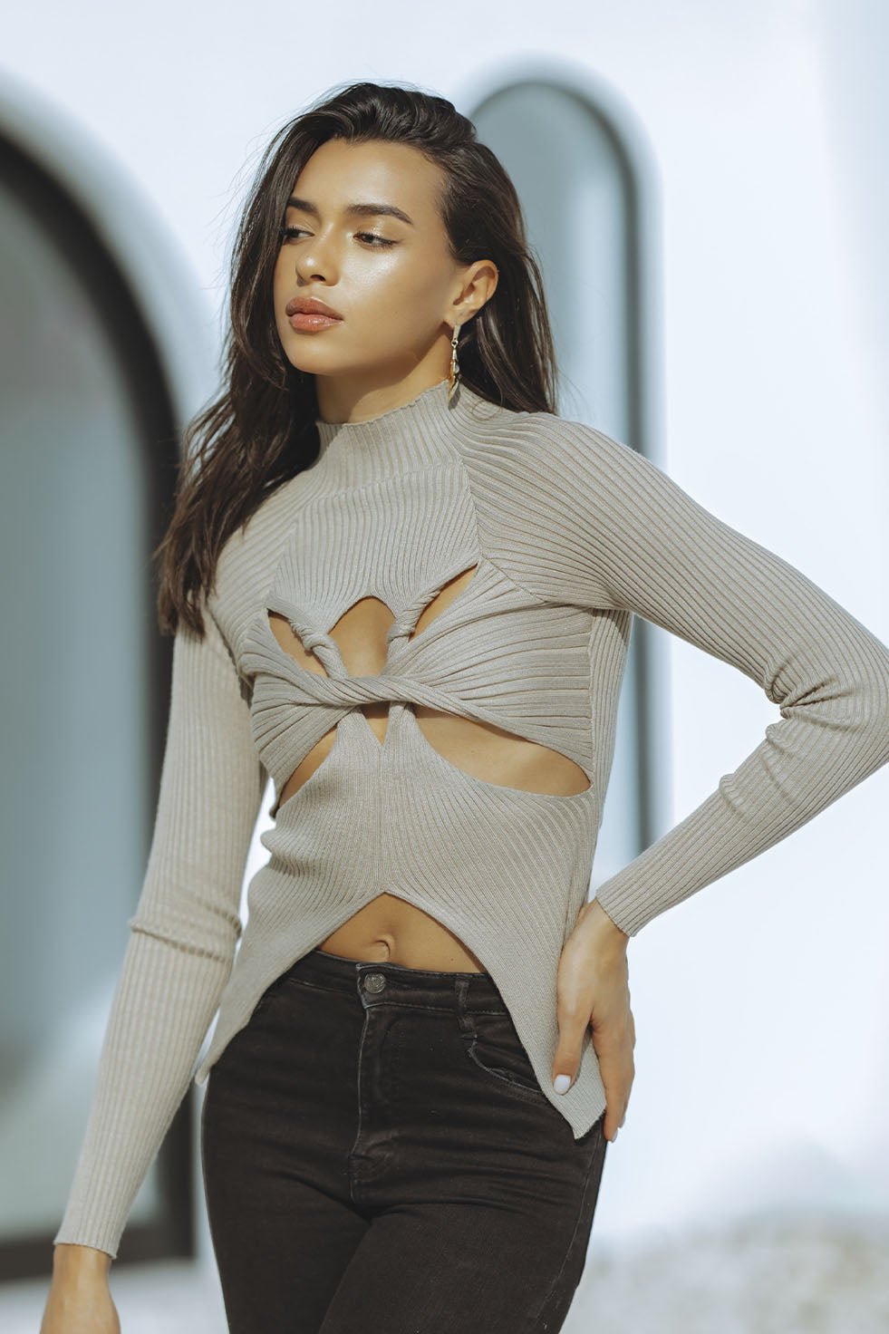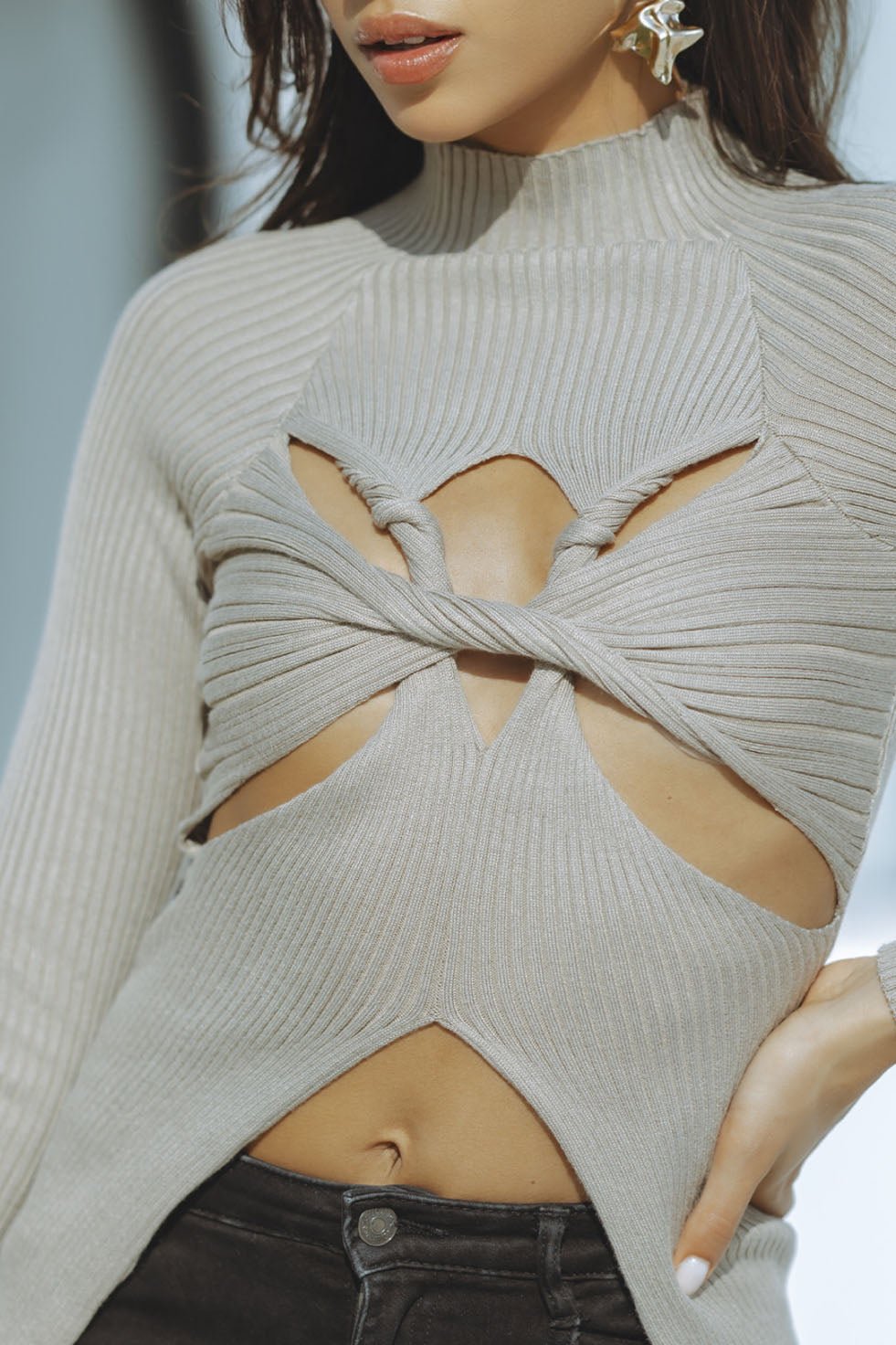 Stay warm and stylish this season with the Sumi knit top. This long-sleeved, khaki mini turtle neck sweater has a cut out bust and belly design and is crafted from a soft blend of cotton and polyester. Easy to dress up or down, pair with black jeans, leggings, or a leather skirt to complete the look. Perfect for chilly fall days.