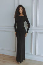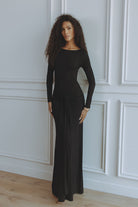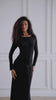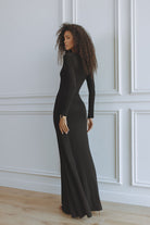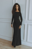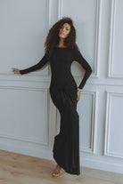 Sleek and timeless, the Sloane Maxi Dress – Black is crafted in soft, stretch jersey for a flawless drape. Designed with a high bateau neckline, long fitted sleeves, and a flattering knotted detail at the waist, it effortlessly enhances your silhouette. The maxi length adds elegance, while the minimalist cut makes it perfect for both evening occasions and elevated everyday wear. A true wardrobe essential for chic, understated sophistication.