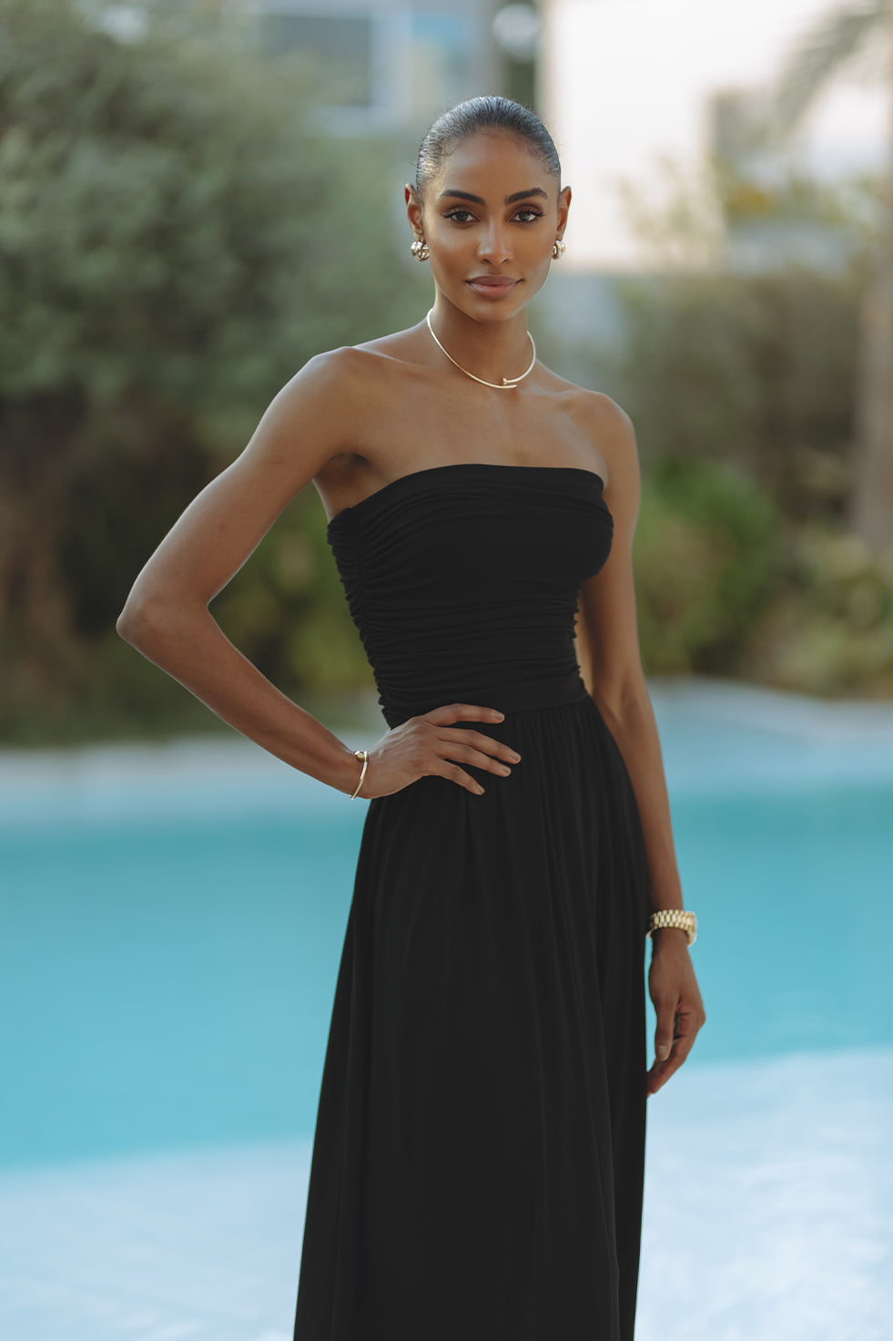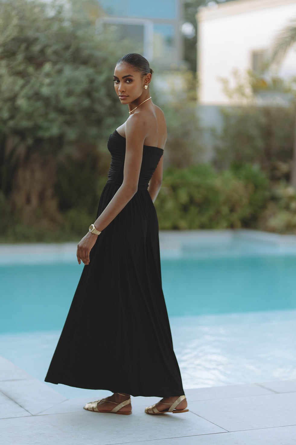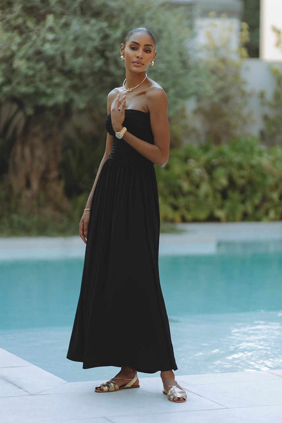 The Wanda maxi dress paired with comfortable heels and statement jewelry |
