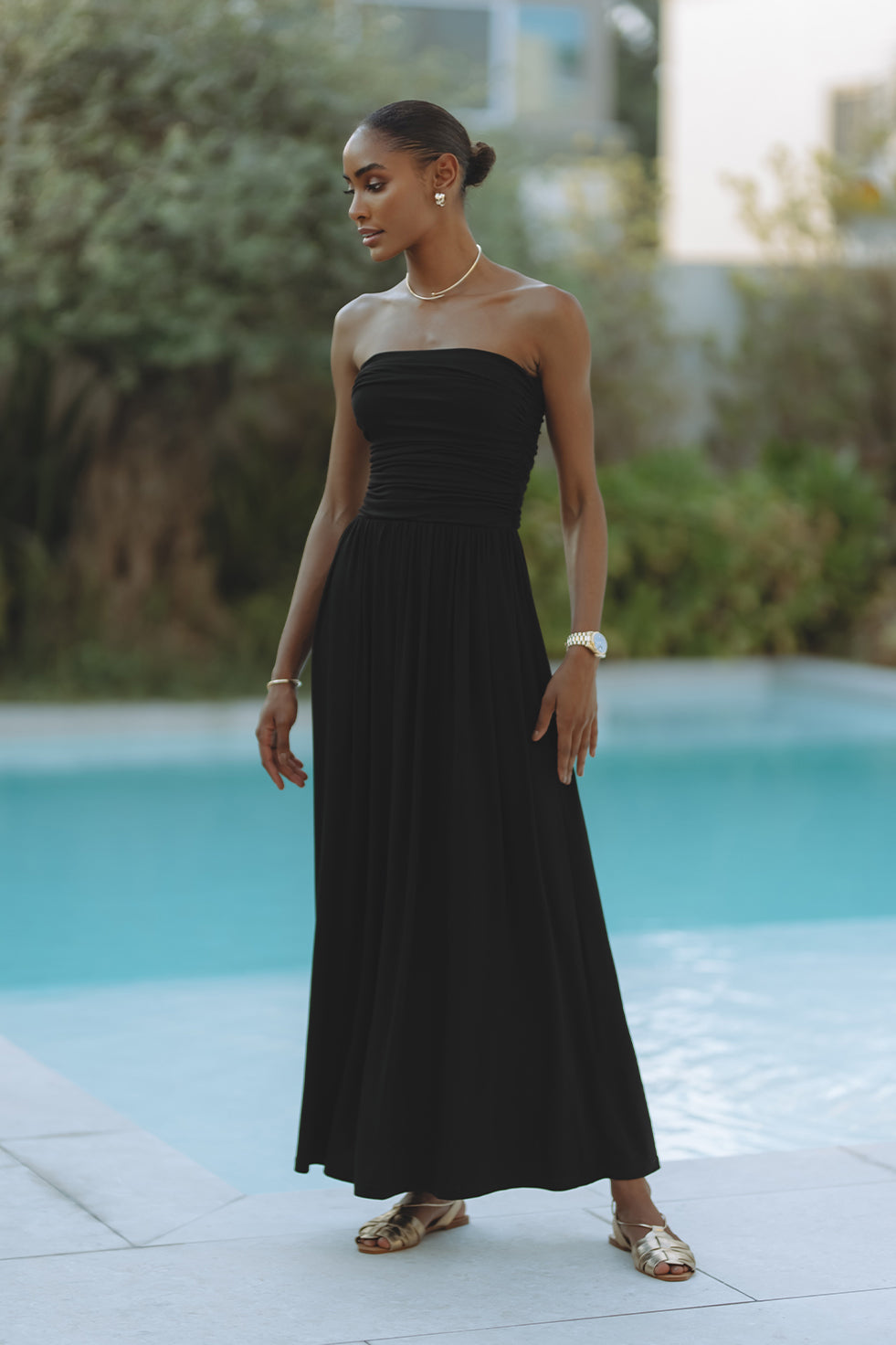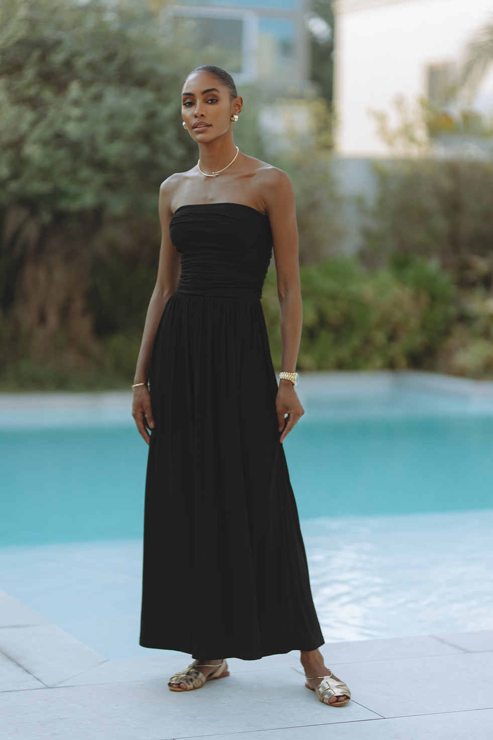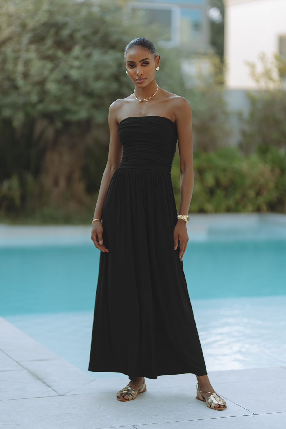 The Wanda maxi dress paired with comfortable heels and statement jewelry |