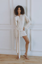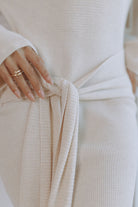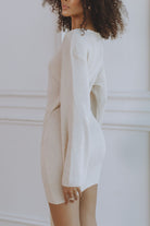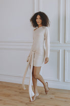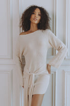 The Himari Knit Mini Dress in sand is the ultimate blend of comfort and effortless sophistication. Crafted from a soft acrylic-cotton blend, it features a relaxed silhouette with an off-shoulder neckline and long sleeves for an understated, feminine appeal. The self-tie detail at the waist allows you to adjust the fit for a more defined shape, while the ribbed knit texture adds subtle dimension. Perfect for transitioning from day to night with minimal effort.