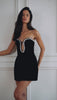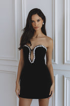The Liora Mini Dress in black is a statement in refined glamour. Cut from plush velvet, this strapless design features a structured hourglass silhouette that sculpts and defines the body. A plunging sweetheart neckline is framed with crystal embellishments, creating a striking contrast against the deep black base and adding a touch of evening allure. Designed for nights that call for confidence and sophistication, Liora is timeless, bold, and unmistakably elegant.
