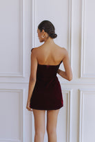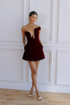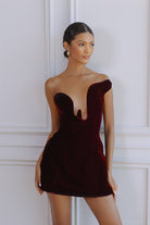 Sculptural. Statement. Sensual. The ROSALYN Hourglass Mini Dress is designed to command the room. Crafted from a rich, plush burgundy velvet, this silhouette frames the décolletage with a dramatic curved bodice and a deep plunge that contours and highlights the natural shape. The structured waist cinches elegantly, flowing into a soft A-line mini skirt that moves with subtle shine and depth.