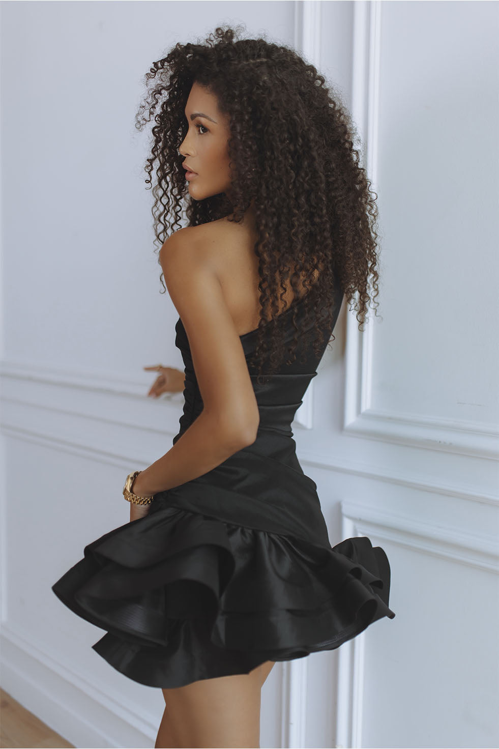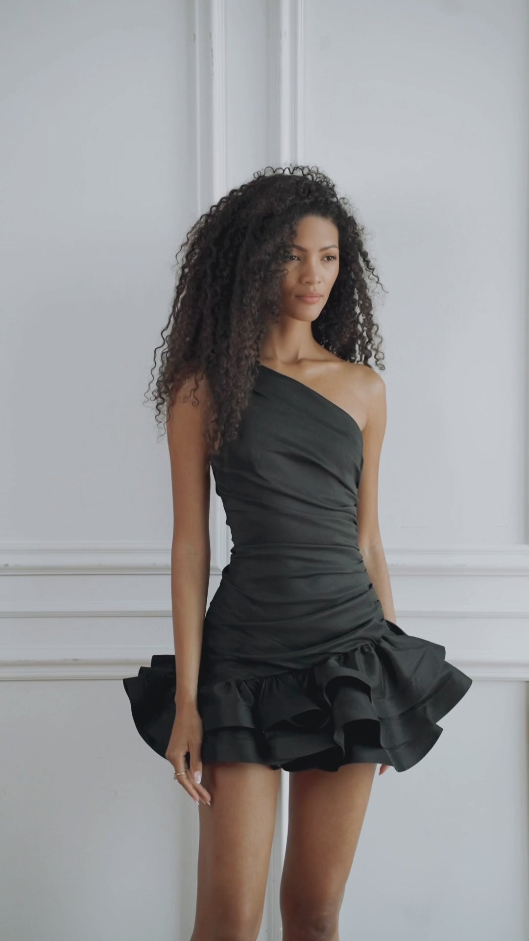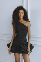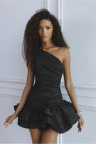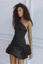 The Gigi Asymmetric Mini Dress is designed to make an effortless statement. Crafted in classic black, this one shoulder silhouette features soft draping across the bodice that contours the waist, flowing into a playful layered ruffle hem for movement and charm.