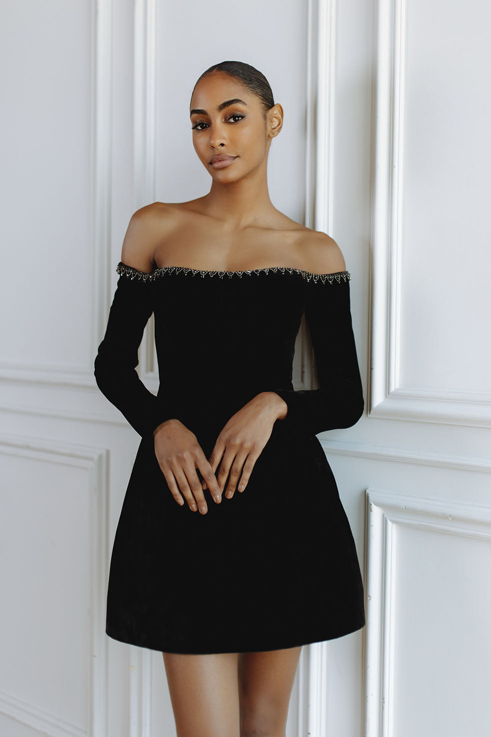 NADENE VELVET HOURGLASS MINI DRESS - BLACK