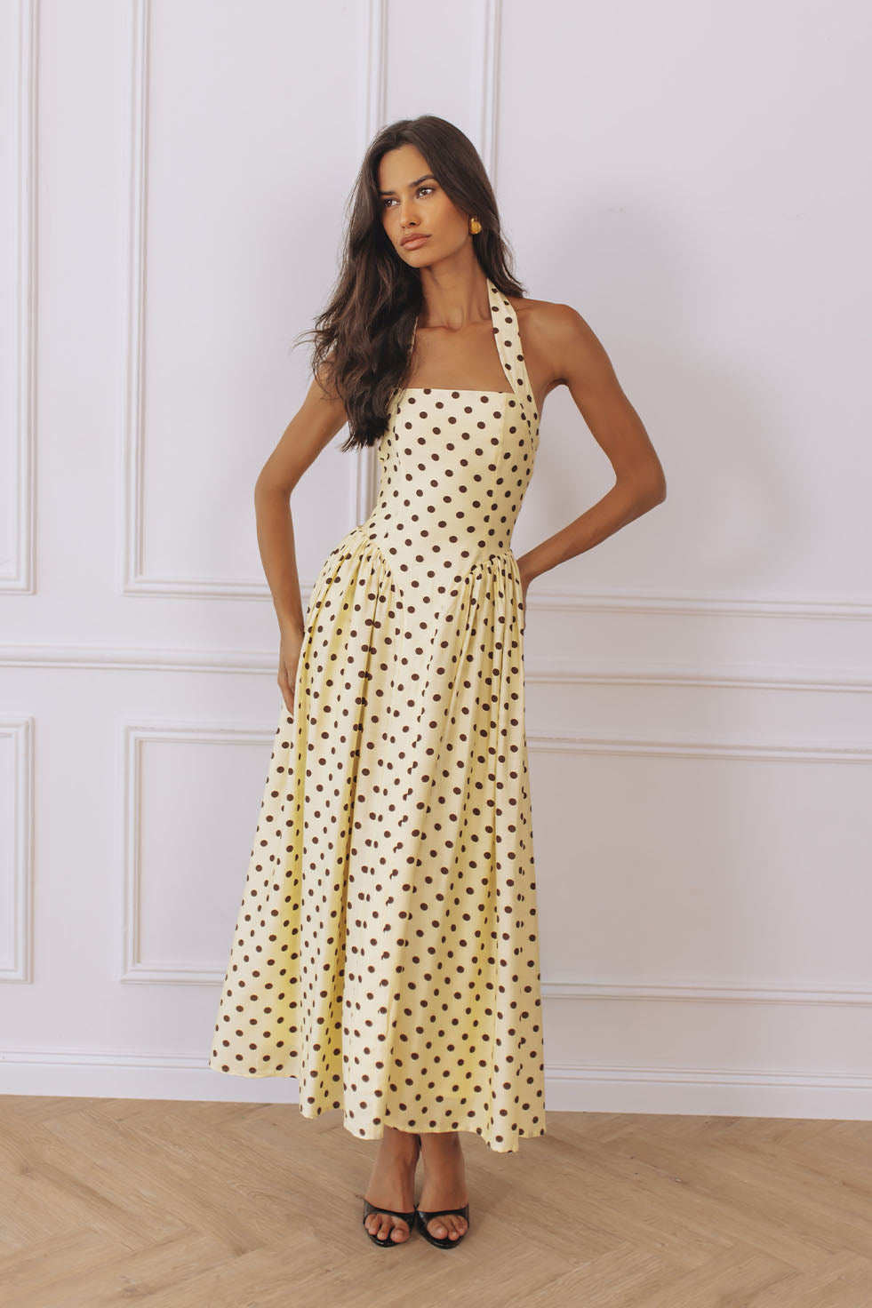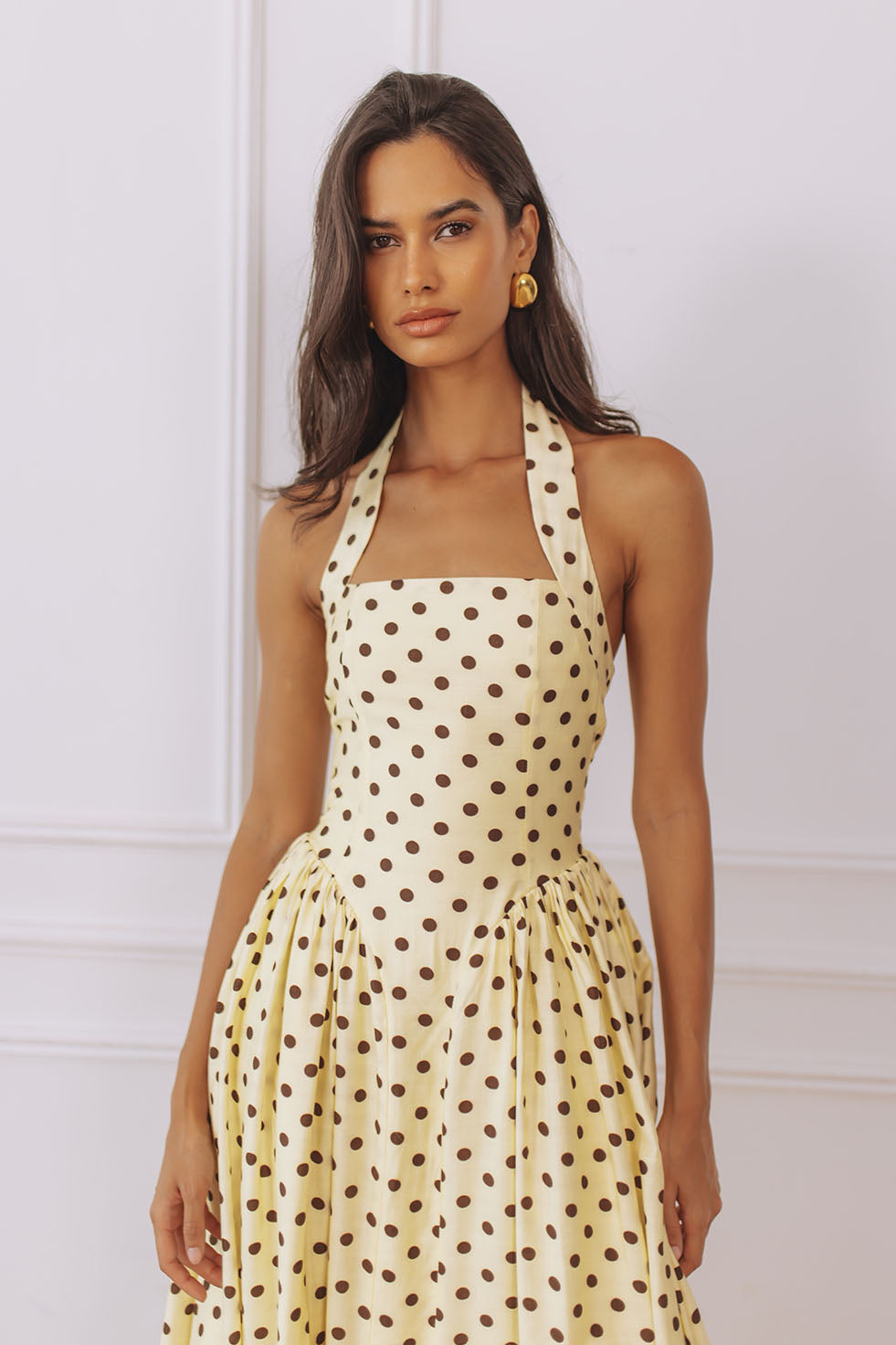 SAMMI HALTER MIDI DRESS - LEMON/CHOC POLKA