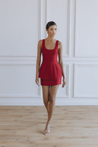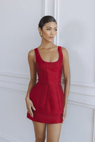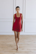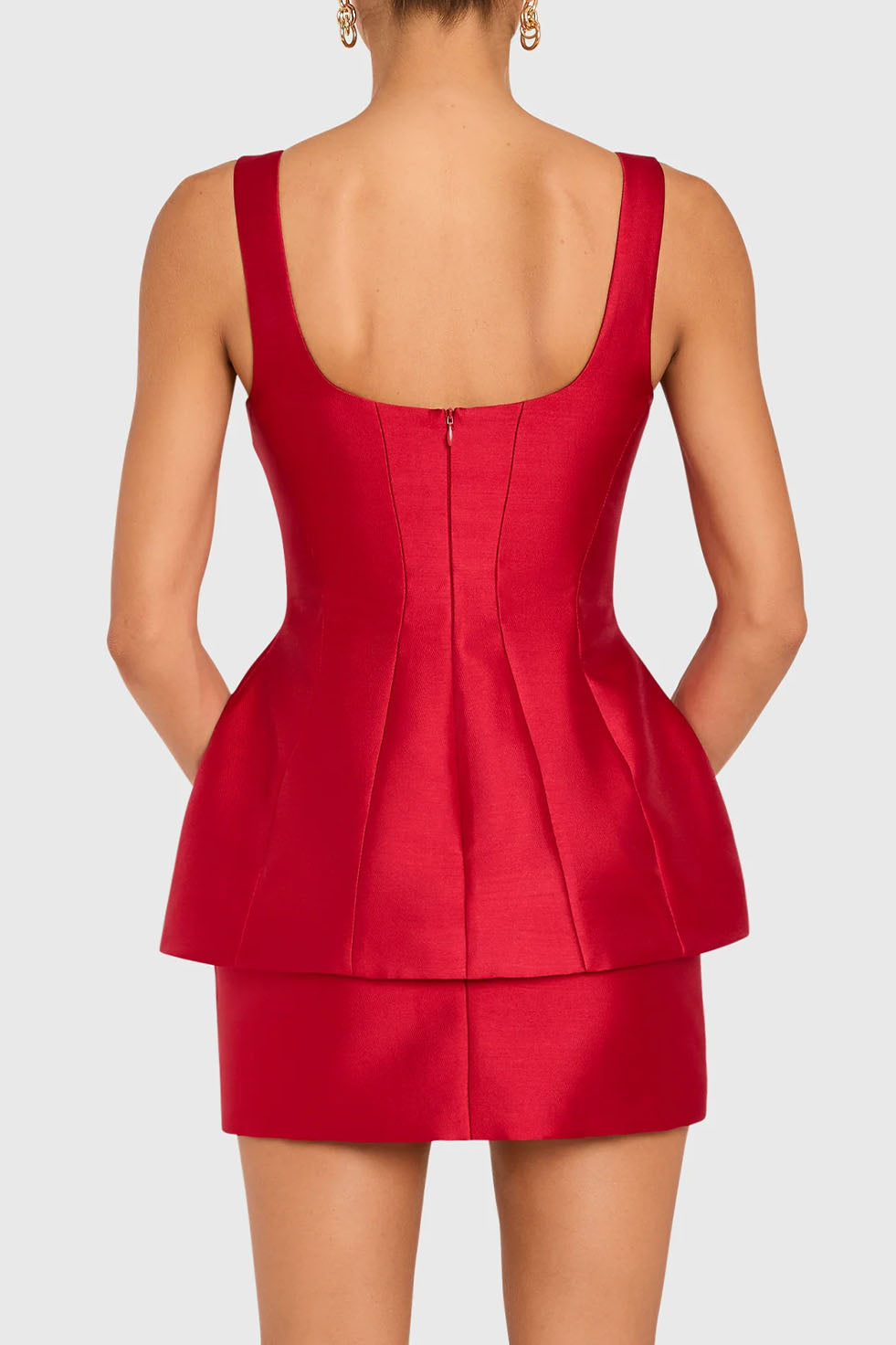 A sculpted moment. The Empire Dress is cut from a structured satin that cinches and shapes the body, creating a defined hourglass silhouette. Featuring a rounded neckline, paneled bodice and a peplum flare that accentuates the waist. Finished in a striking scarlet red for timeless evening elegance.