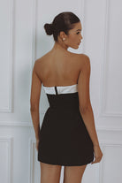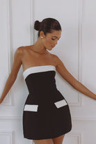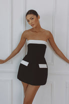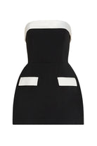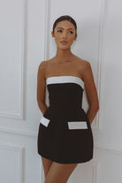 Clean lines. Sculpted shape. The Lucienne Hourglass Romper features a strapless neckline with ivory contrast detailing and subtle faux pocket accents. Designed with internal structure to contour the waist and create a refined, timeless silhouette. Mini length with hidden shorts for ease and comfort.
