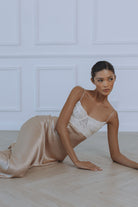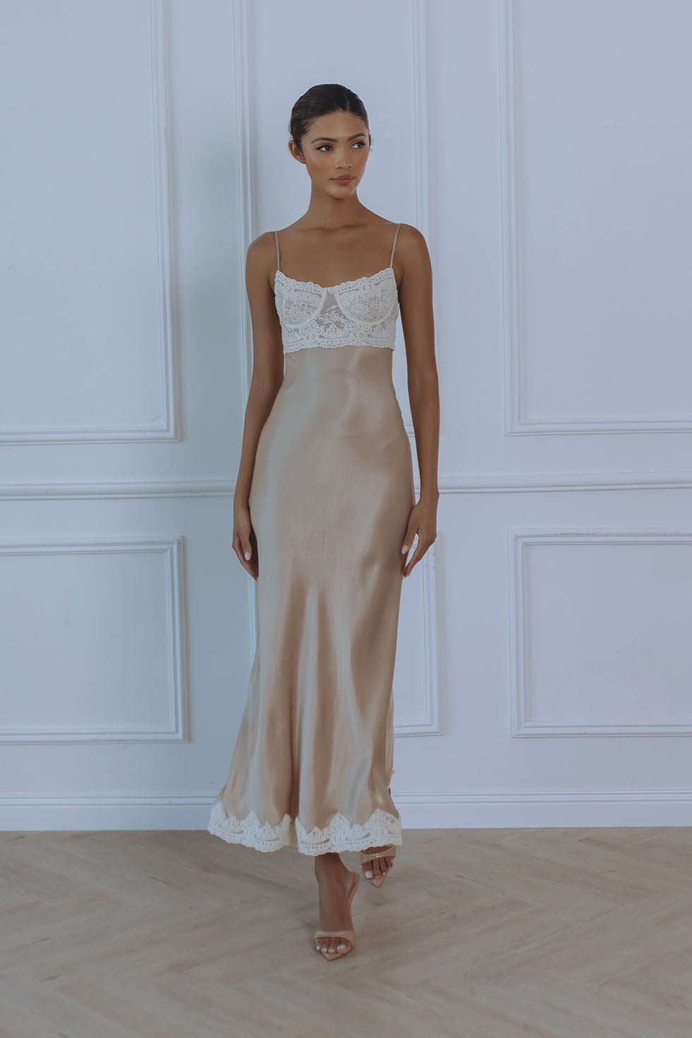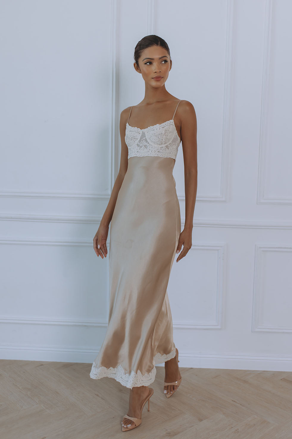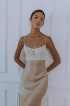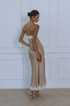 TZARIANA SATIN LACE MIDI DRESS - GOLDEN