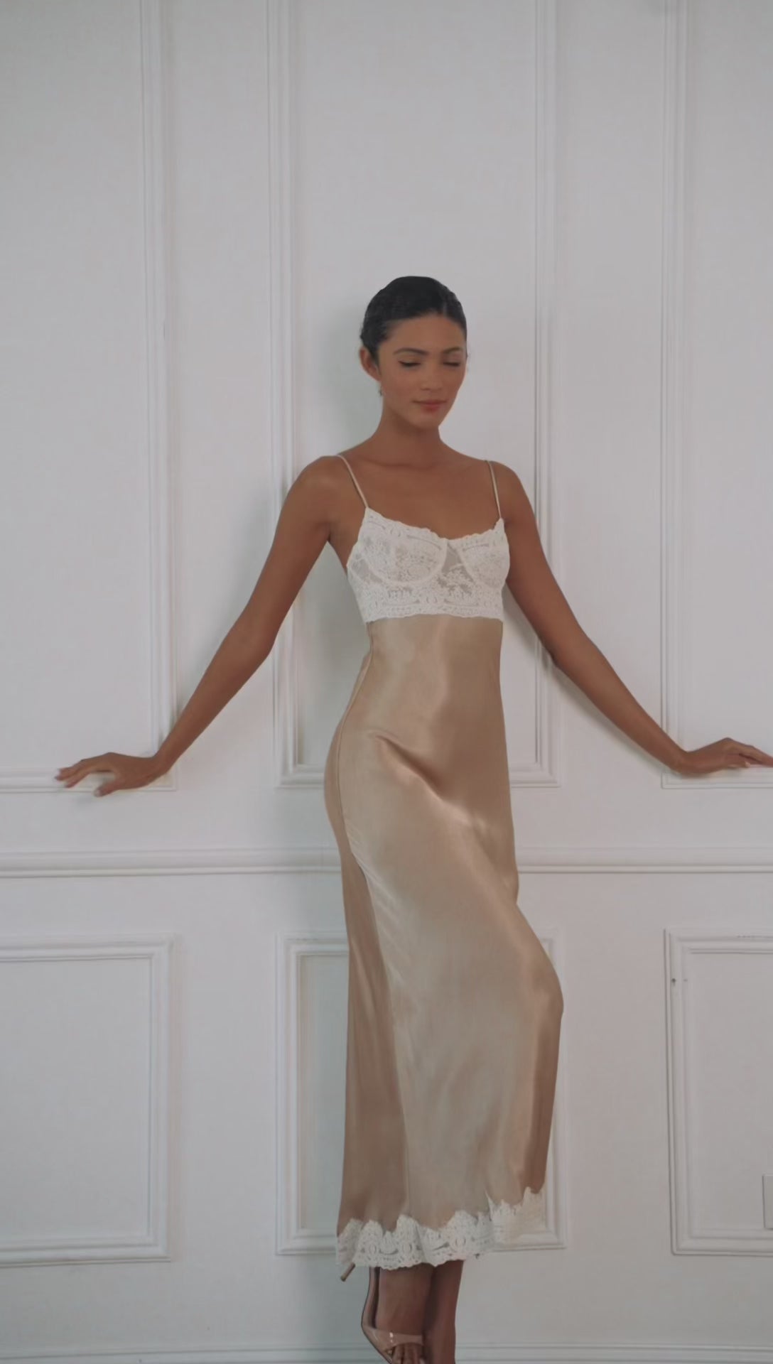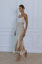 Slip into pure elegance with the Tzariana Satin Lace Midi Dress. Crafted in a golden satin sheen, this bias-cut silhouette drapes effortlessly over your curves. Delicate ivory lace trims the bustier bodice and hem, adding romantic contrast. Adjustable straps and a structured bust offer both comfort and support. Perfect for date nights or candlelit soirées—this dress whispers luxury with every step.
