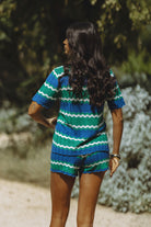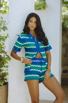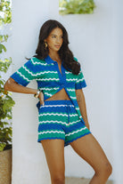 Expertly crafted from a blend of 55% acrylic and 45% cotton, these Cam shorts in green and blue are perfect for casual wear. With a mini length and scalloped hemline, they offer a stylish yet comfortable fit. The elastic waistband and drawstring ensure a customizable fit. Pair them with the coordinating Cam shirt for a complete look.