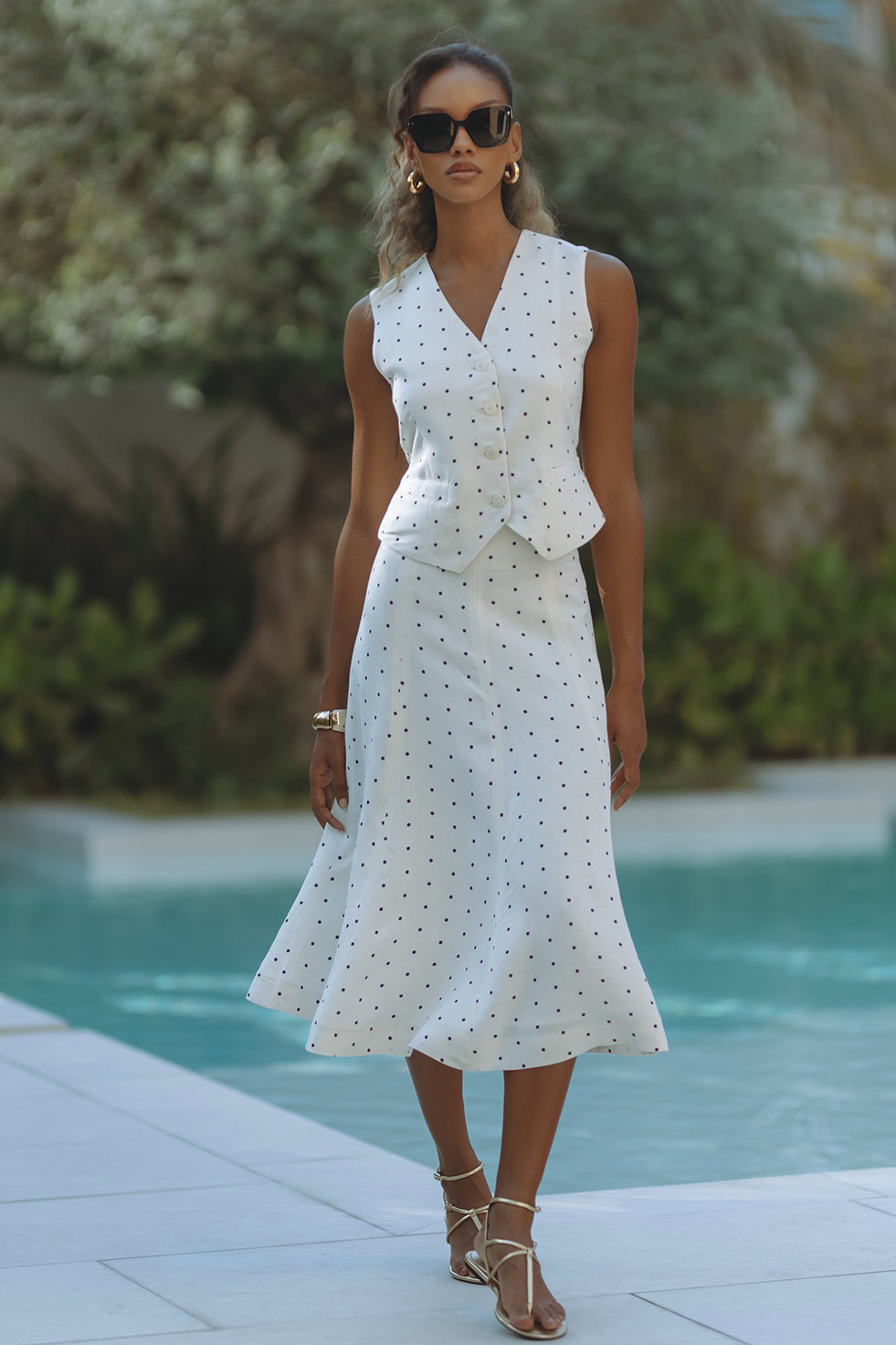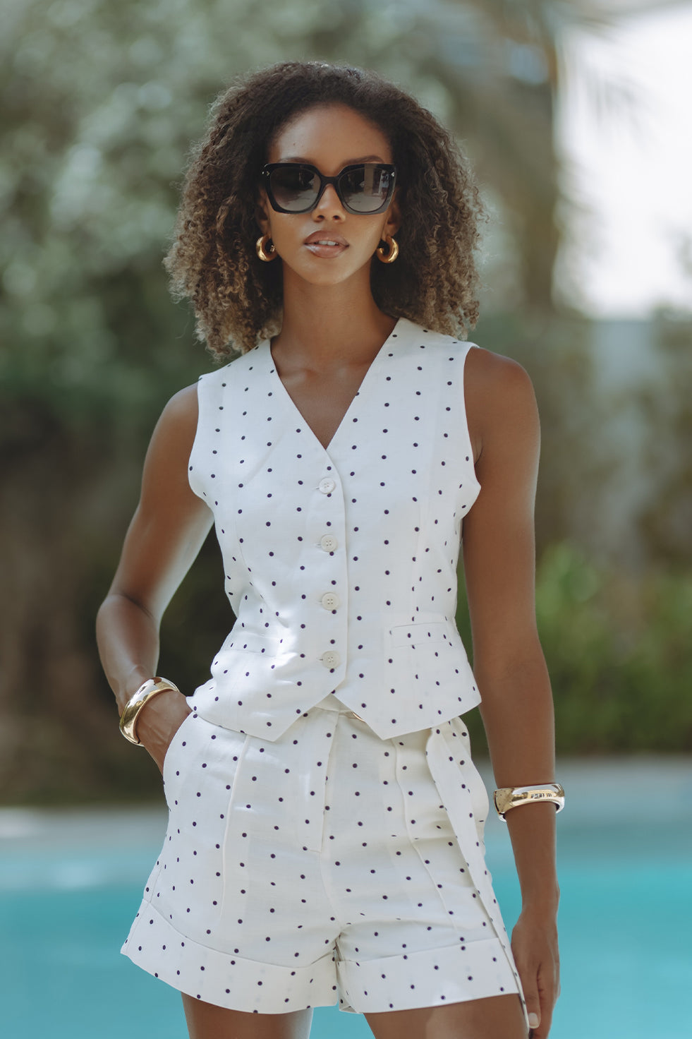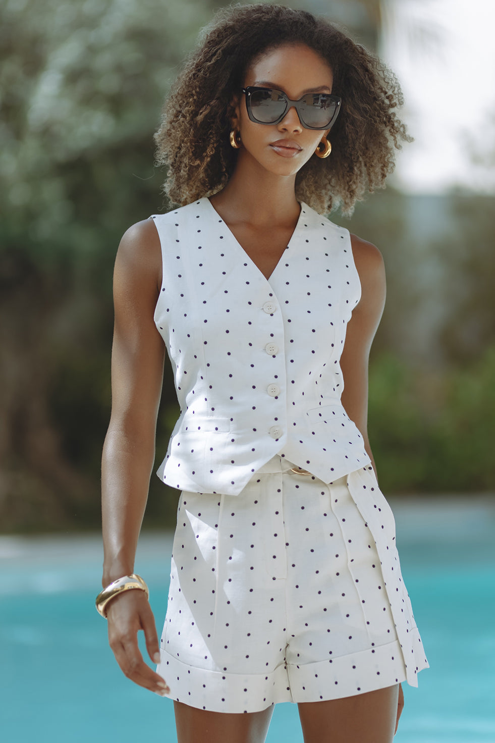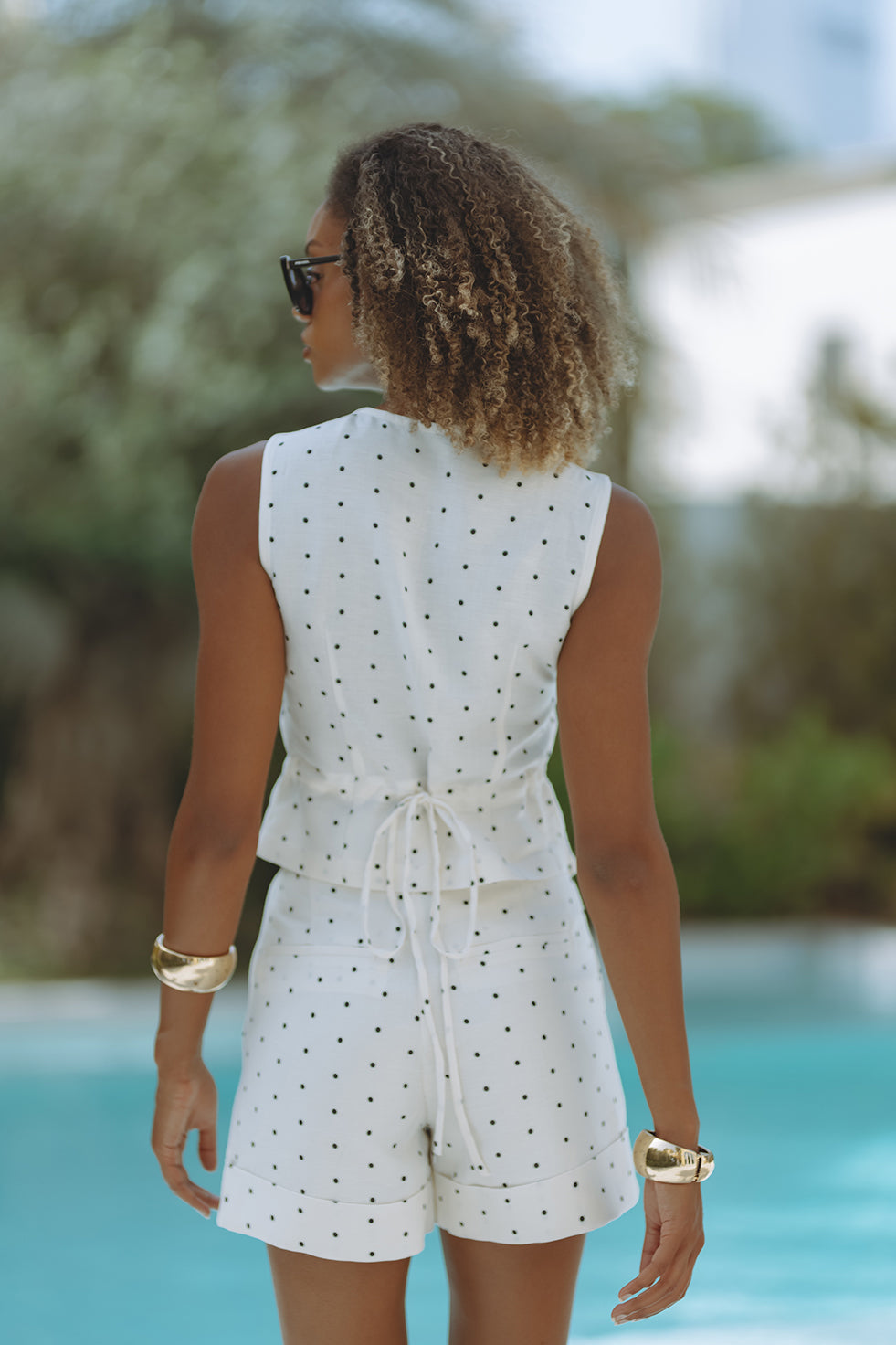 Chic and tailored, the Gabby Vest in soft linen-viscose brings effortless polish to warm-weather days. Featuring a flattering V-neckline, button front, and subtle waist shaping with a back tie detail, it’s playfully patterned in classic black polka dots on crisp white. Pair it with matching shorts for a resort-ready statement that feels both timeless and fresh.