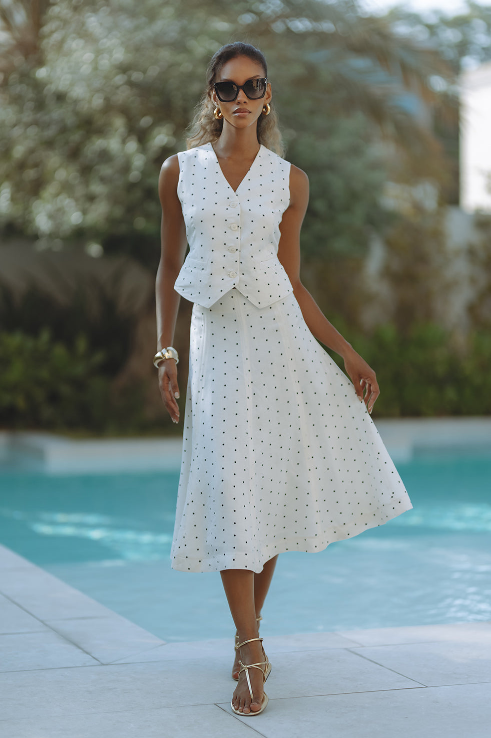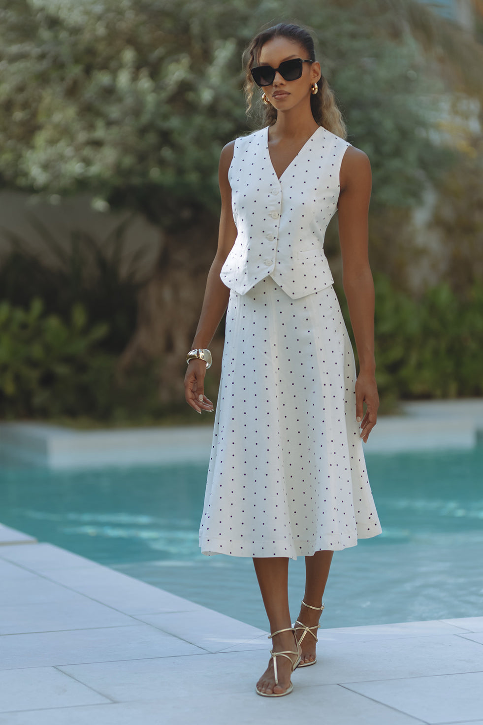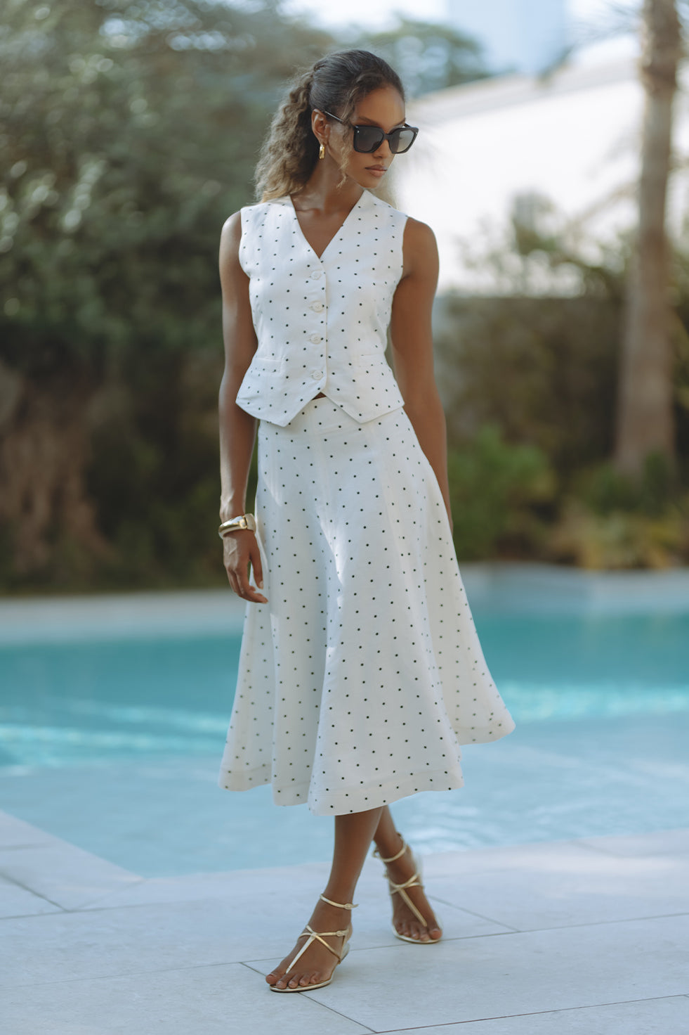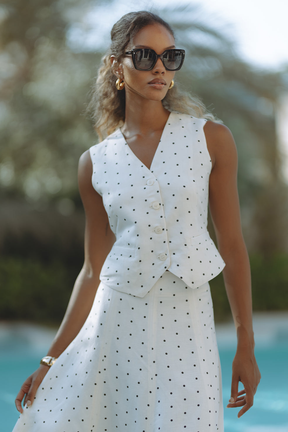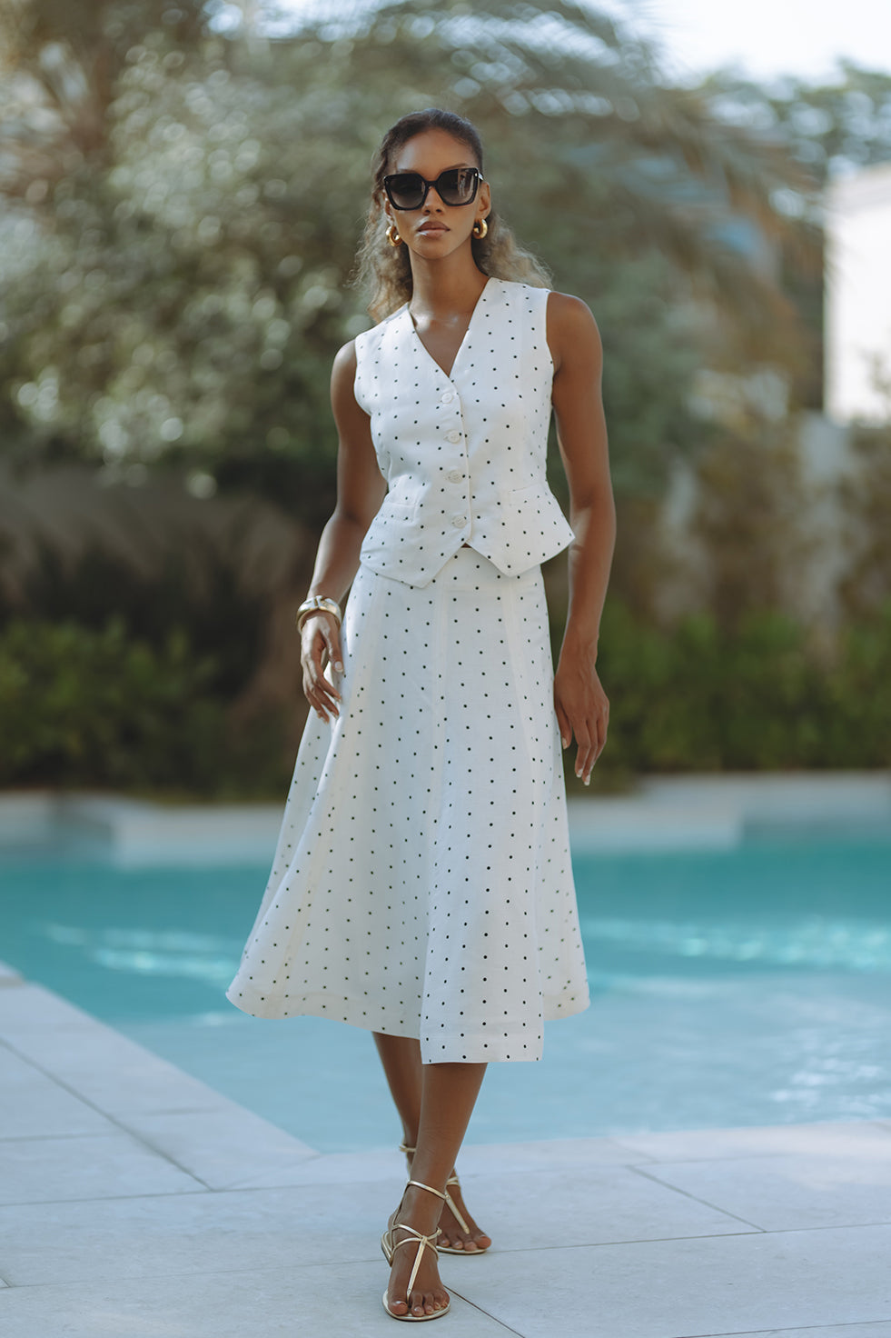 Chic and tailored, the Gabby Vest in soft linen-viscose brings effortless polish to warm-weather days. Featuring a flattering V-neckline, button front, and subtle waist shaping with a back tie detail, it’s playfully patterned in classic black polka dots on crisp white. Pair it with matching shorts for a resort-ready statement that feels both timeless and fresh.