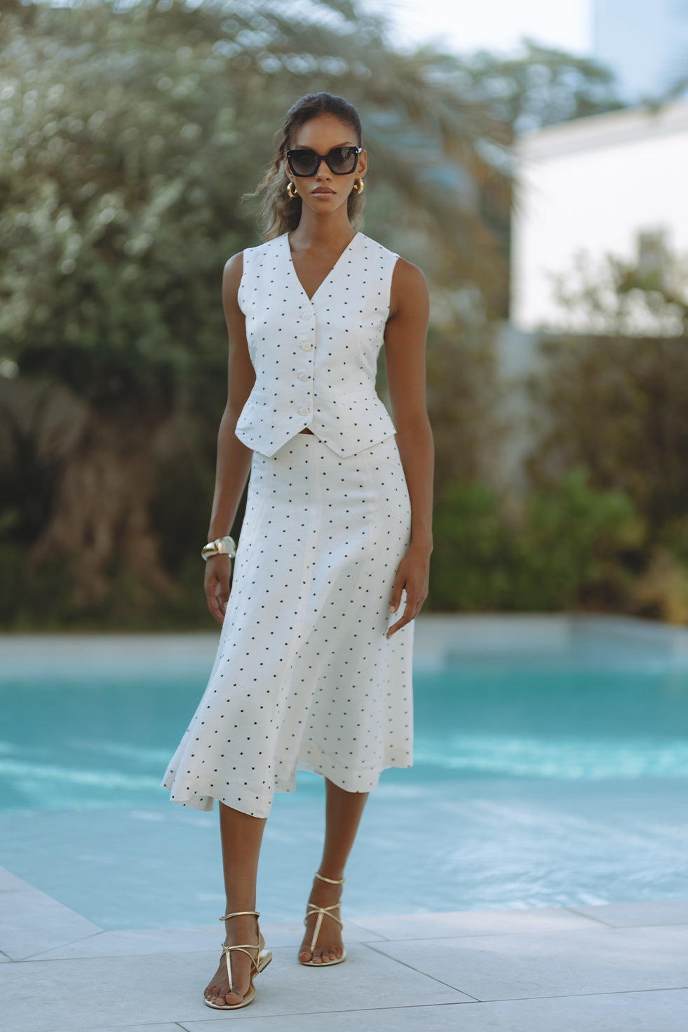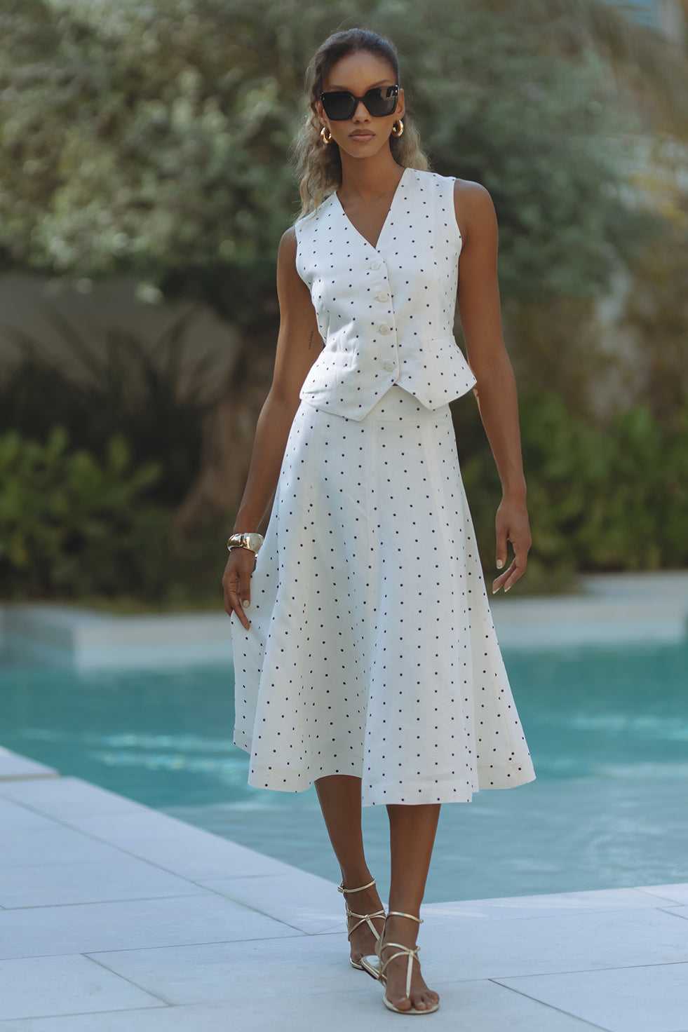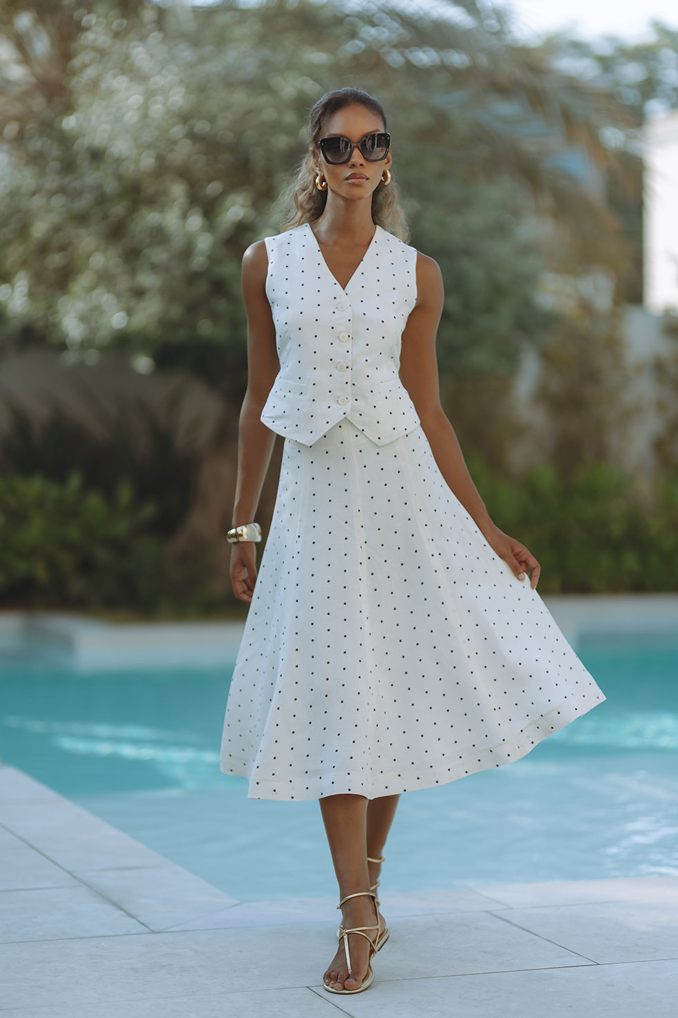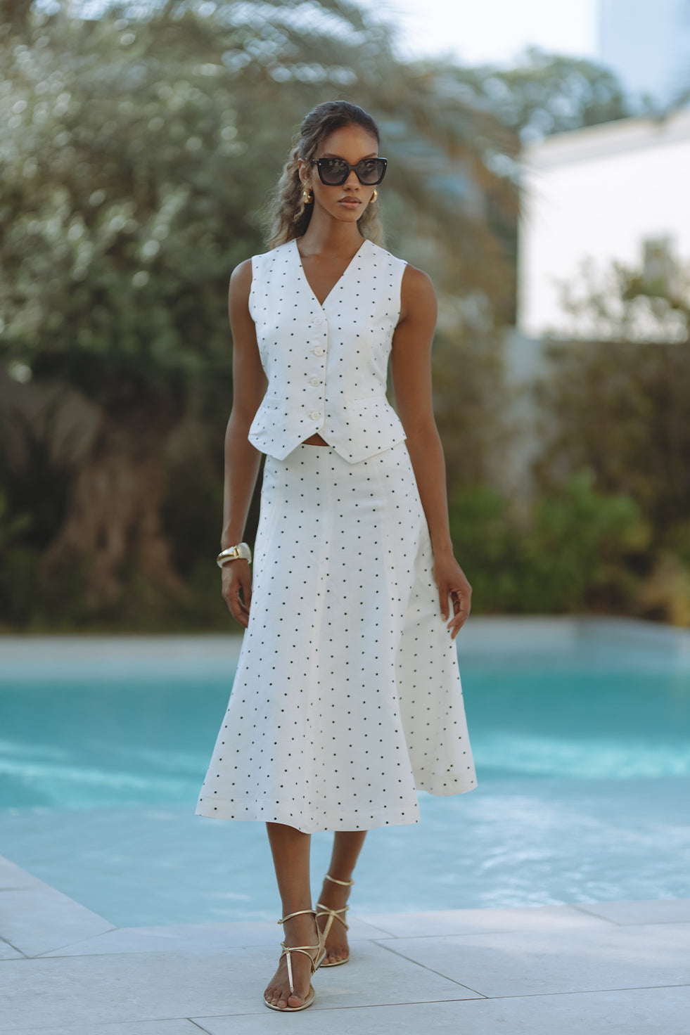 Chic and tailored, the Gabby Vest in soft linen-viscose brings effortless polish to warm-weather days. Featuring a flattering V-neckline, button front, and subtle waist shaping with a back tie detail, it’s playfully patterned in classic black polka dots on crisp white. Pair it with matching shorts for a resort-ready statement that feels both timeless and fresh.