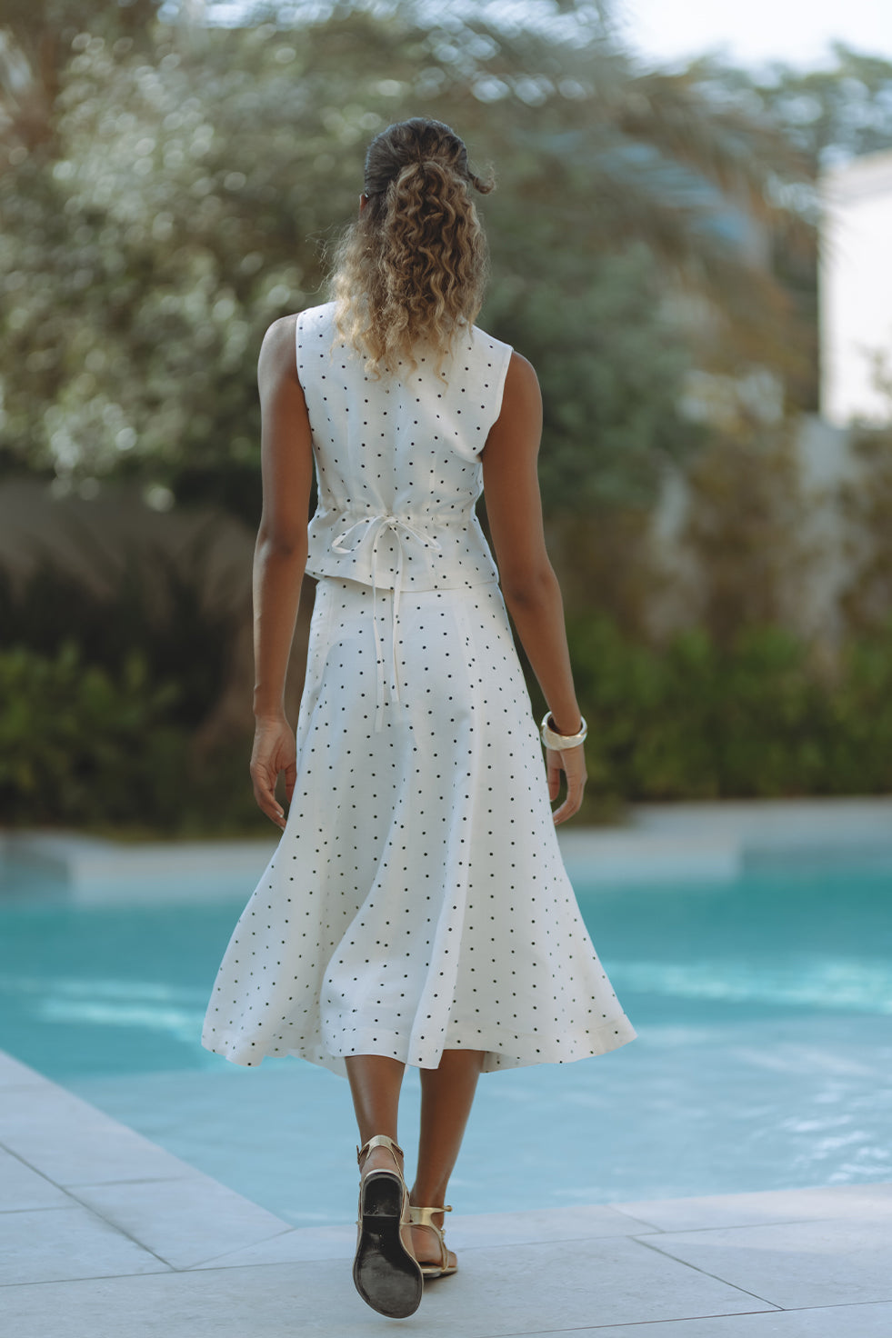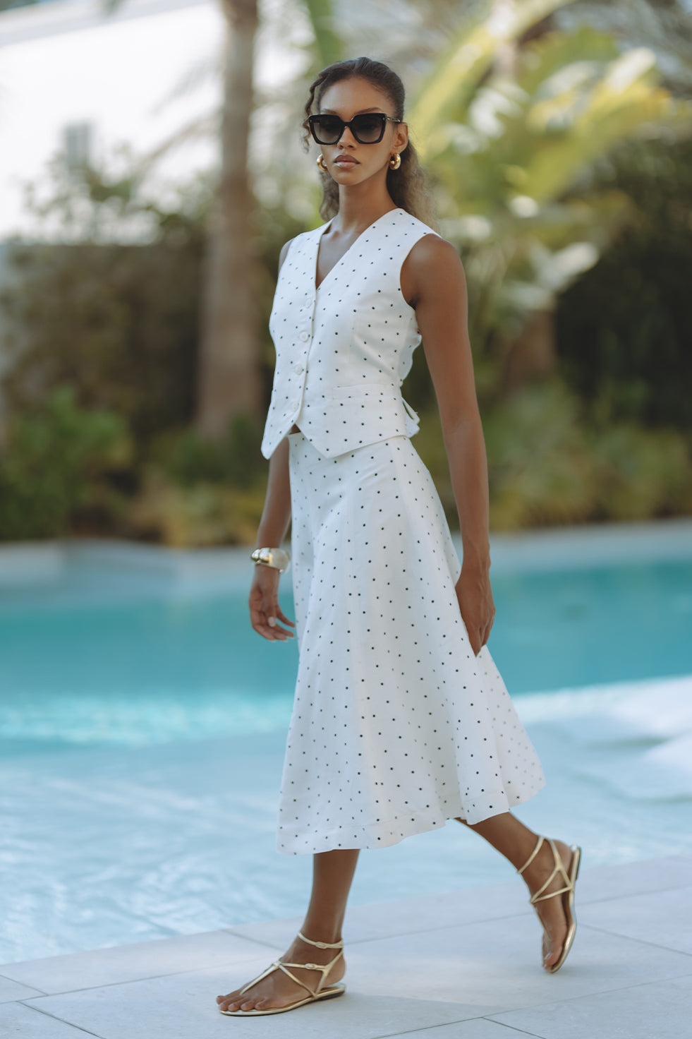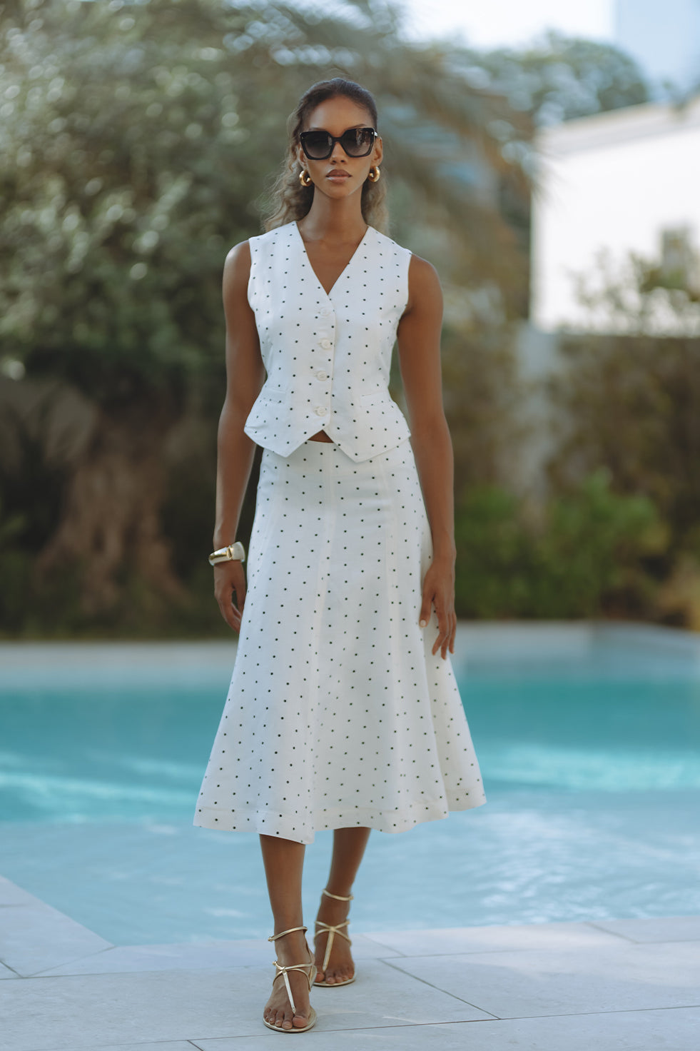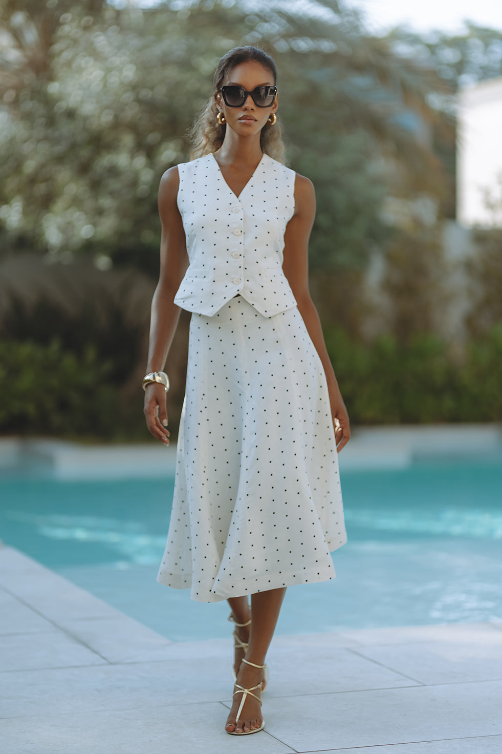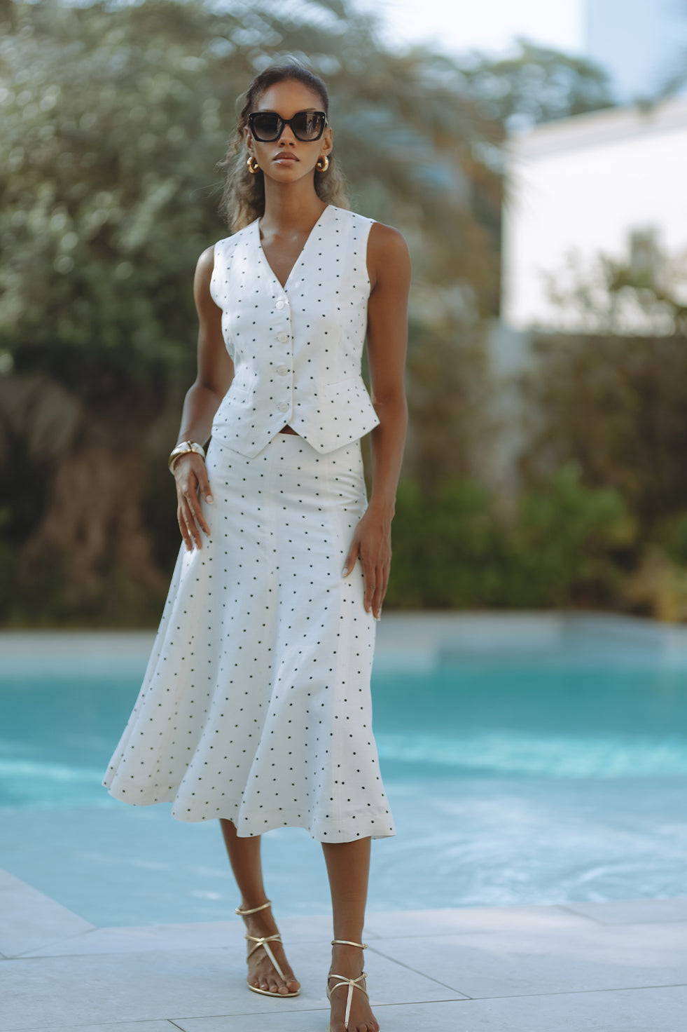 Chic and tailored, the Gabby Vest in soft linen-viscose brings effortless polish to warm-weather days. Featuring a flattering V-neckline, button front, and subtle waist shaping with a back tie detail, it’s playfully patterned in classic black polka dots on crisp white. Pair it with matching shorts for a resort-ready statement that feels both timeless and fresh.