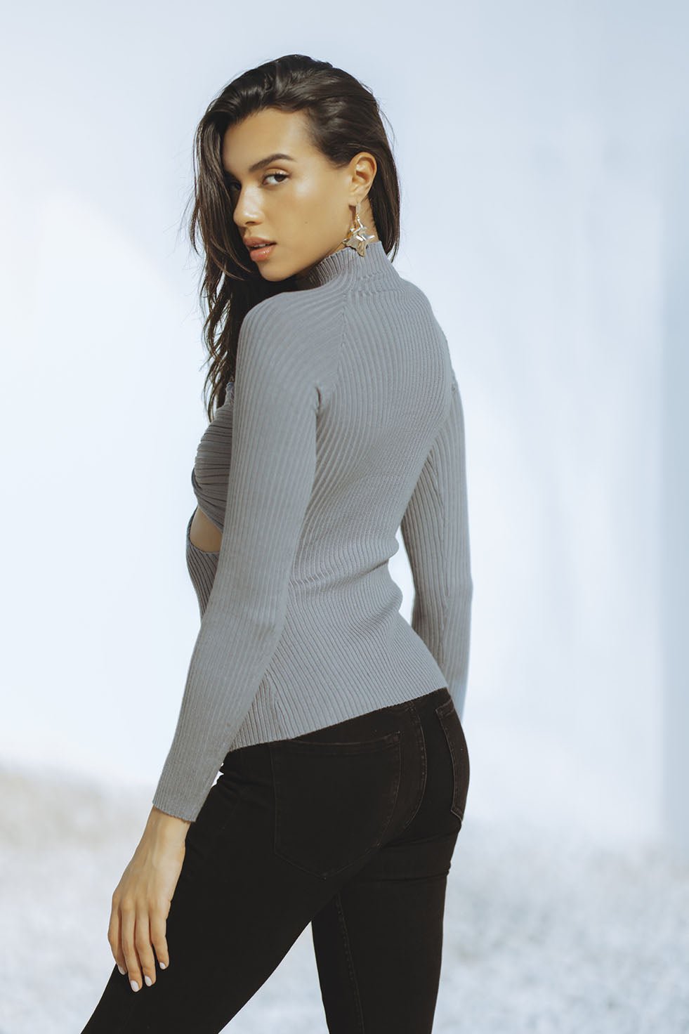 The Sumi knit sweater is the perfect balance of comfort and style. The sweater combines a cotton and polyester blend with a turtle neck design and long sleeves, making it durable and warm. The unique cut-out bust and open belly design make this sweater an attractive choice for any casual occasion or even a chilly night in the desert.
