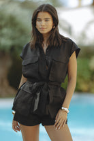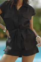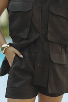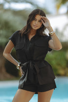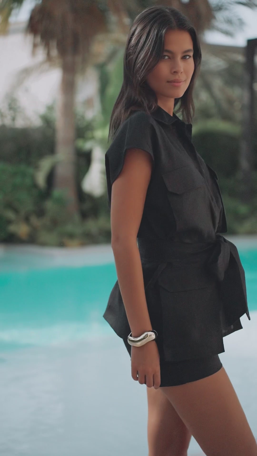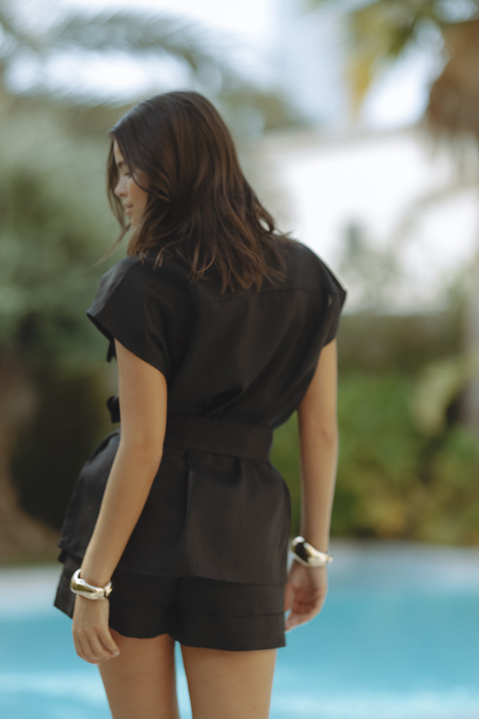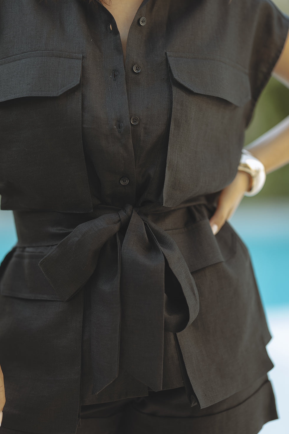 The Loro Linen set in Midnight Black is the perfect addition to your wardrobe. Made from high-quality linen, this set includes stylish shorts with pockets and a button-up shirt with pocket detailing. The included belt adds a touch of sophistication, making it perfect for a casual day out running errands.