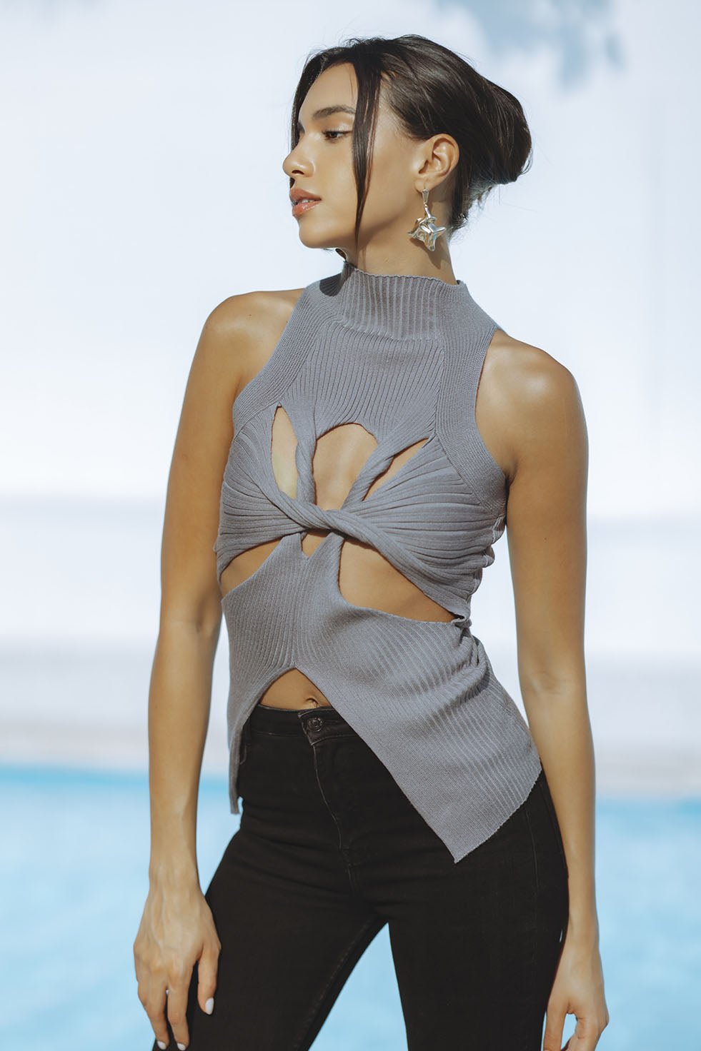 This Sumi knit top is crafted with a unique blend of cotton and polyester. Its sophisticated grey knit fit is designed with a sleeveless turtle neck top and twisted bust cut out detailing. An intriguing under bust cut out accentuates the belly for a fashion-forward look. Pair with jeans or a skirt and spice up your fall wardrobe with this elegantly chic top.