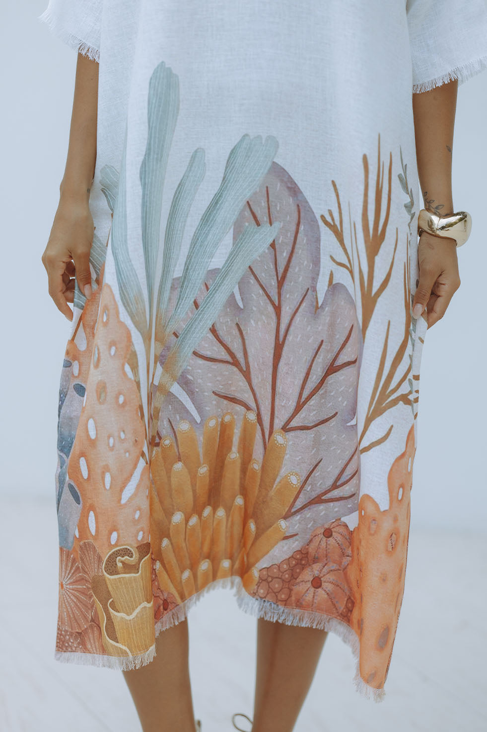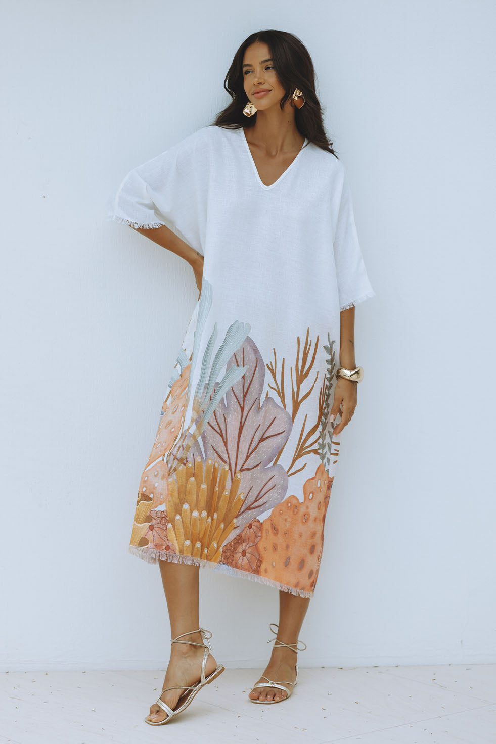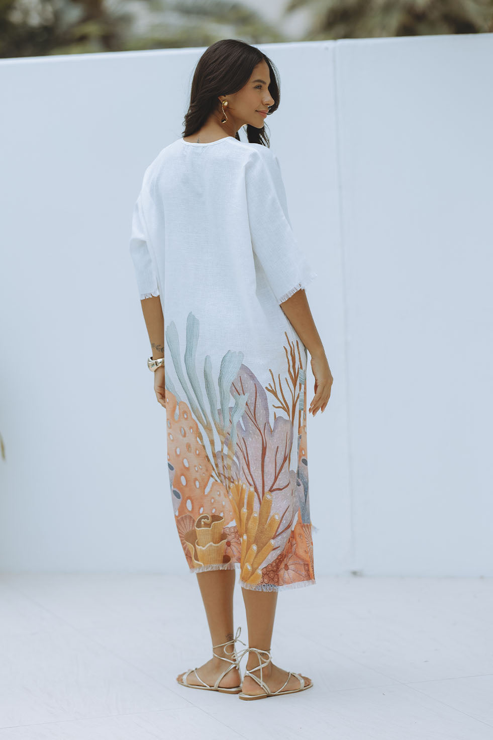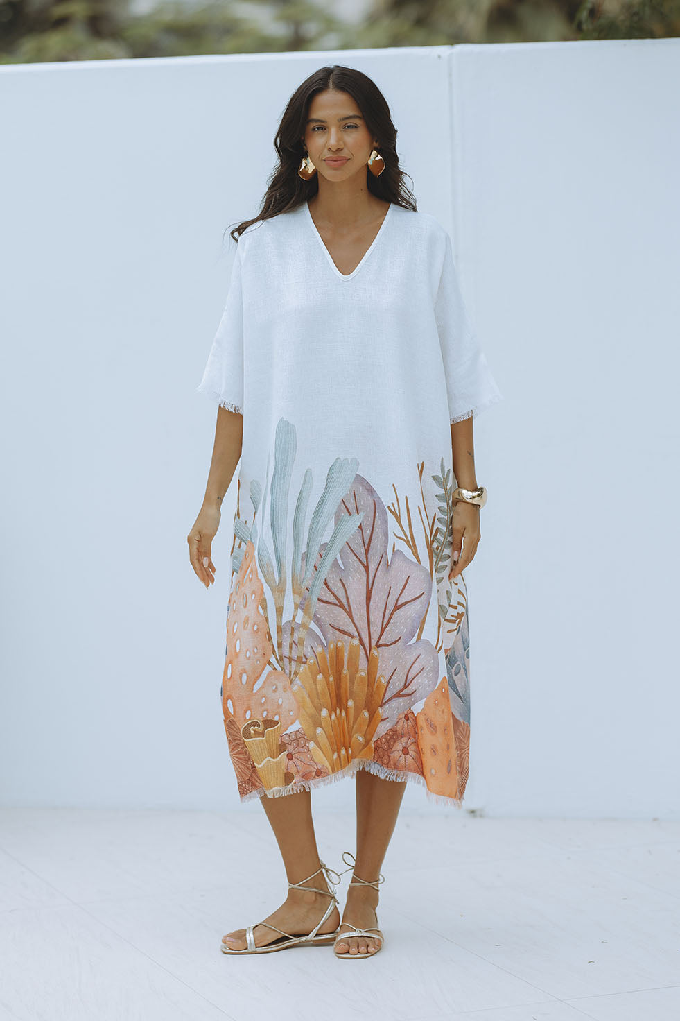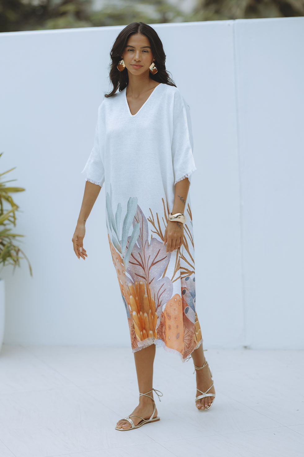 Made from a blend of linen and poly, this white kaftan is designed with a vibrant orange print and a flattering v neckline. With midi sleeves and length, it's the perfect balance of comfort and style for a casual suhoor.