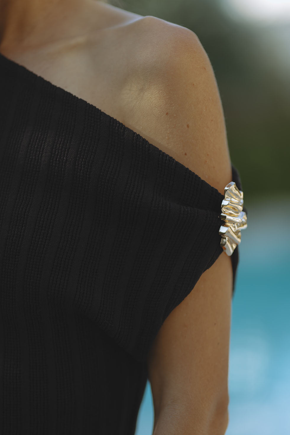 - Sculptural gold trim shoulder detail
