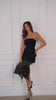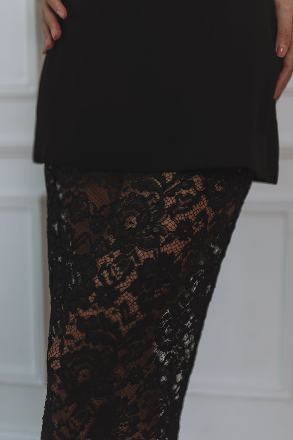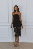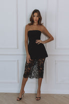 A study in refined evening elegance. The Jada Dress features a structured strapless bodice and a softly flared peplum layer that transitions into a sheer lace midi skirt. Understated, sleek, and striking in silhouette.
