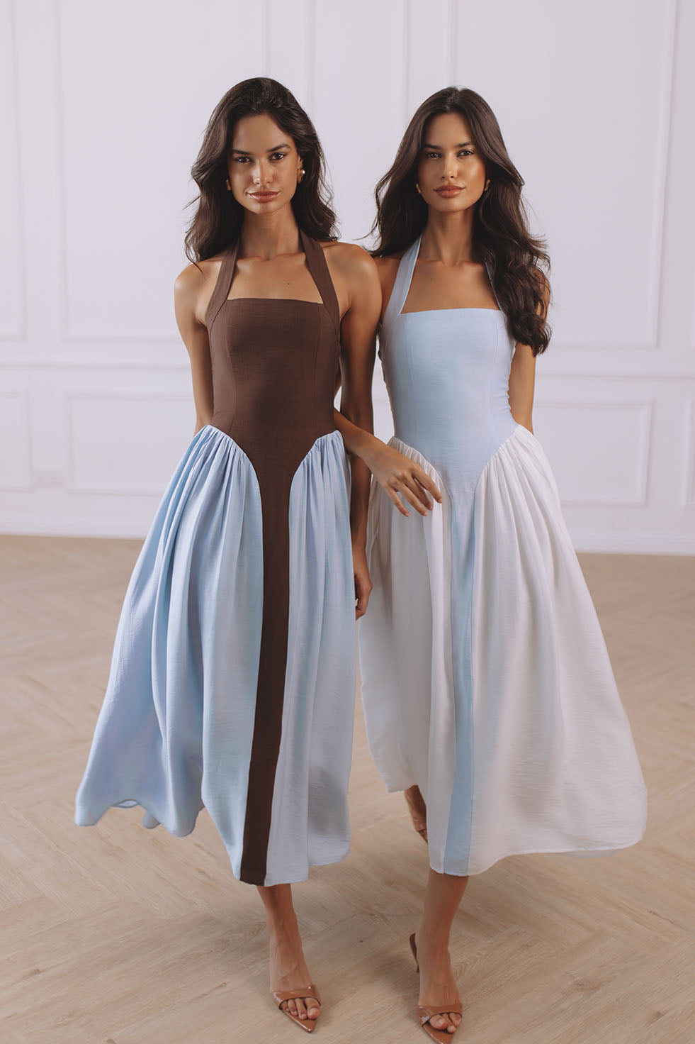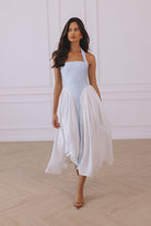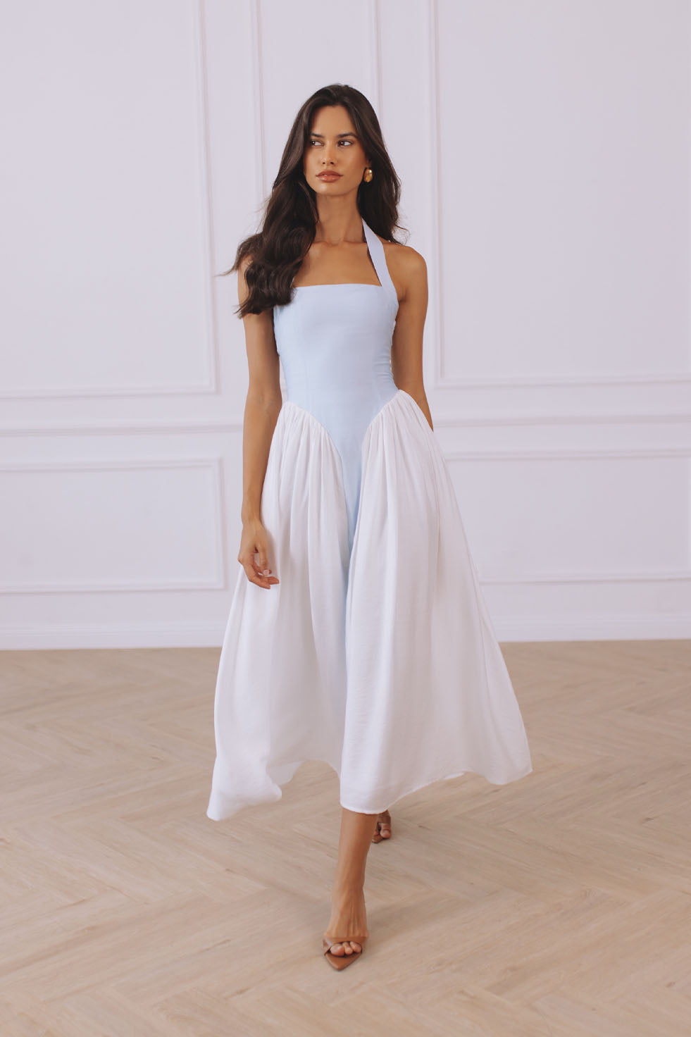 SAMMI HALTER MIDI DRESS - SKY BLUE/WHITE