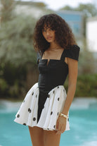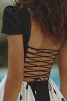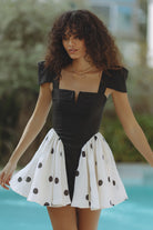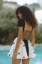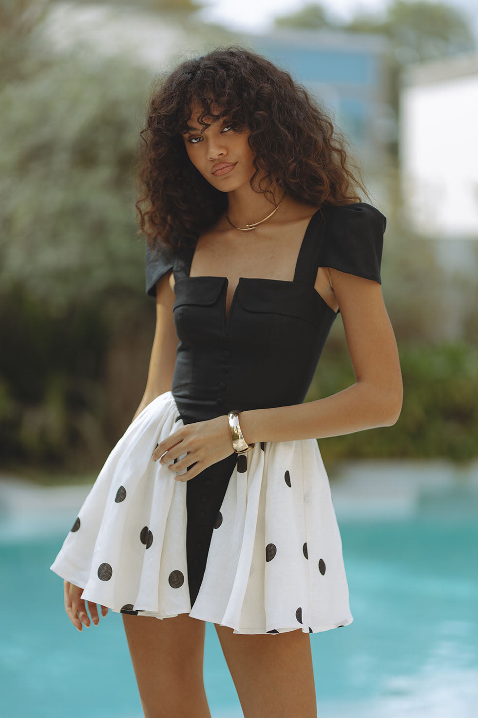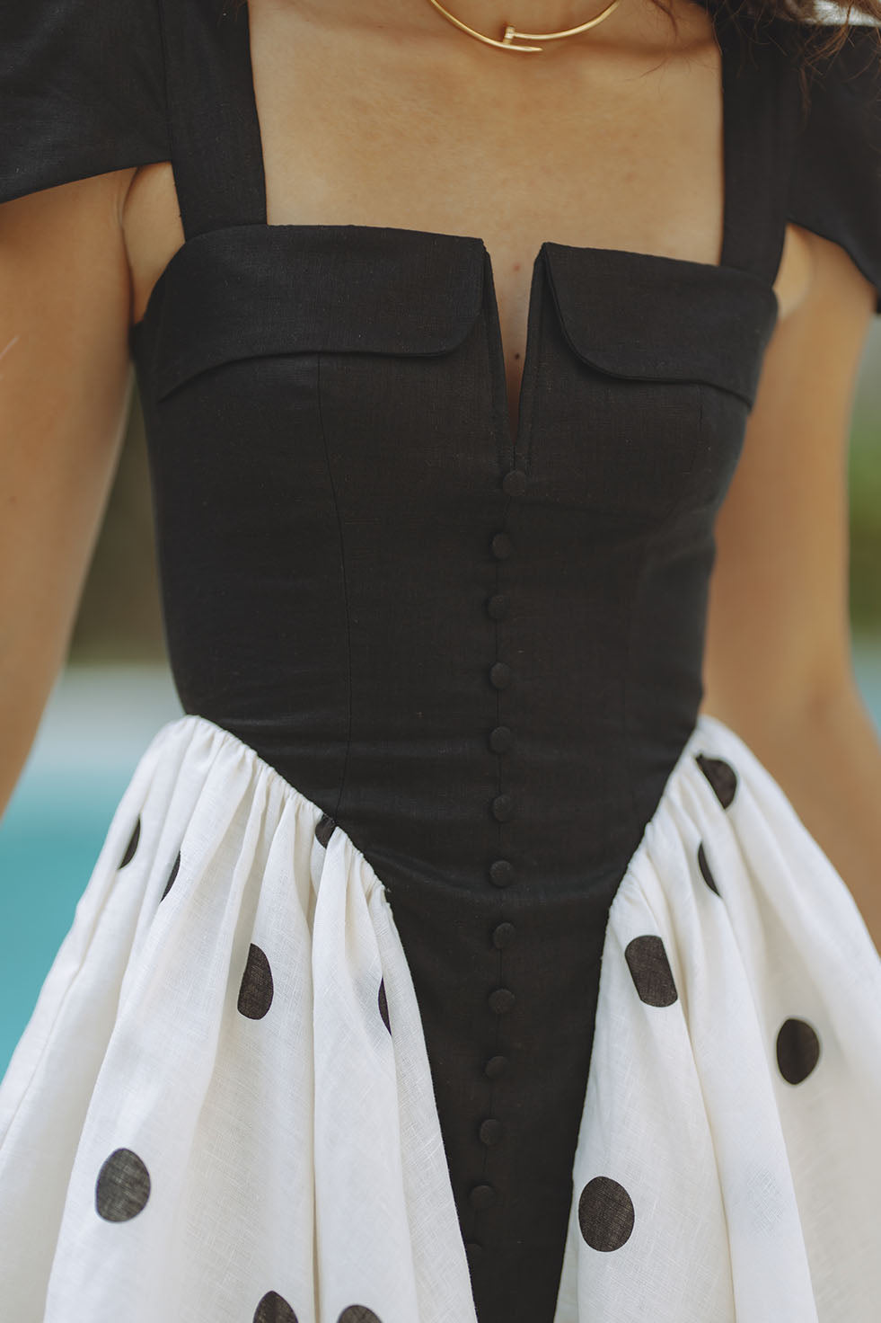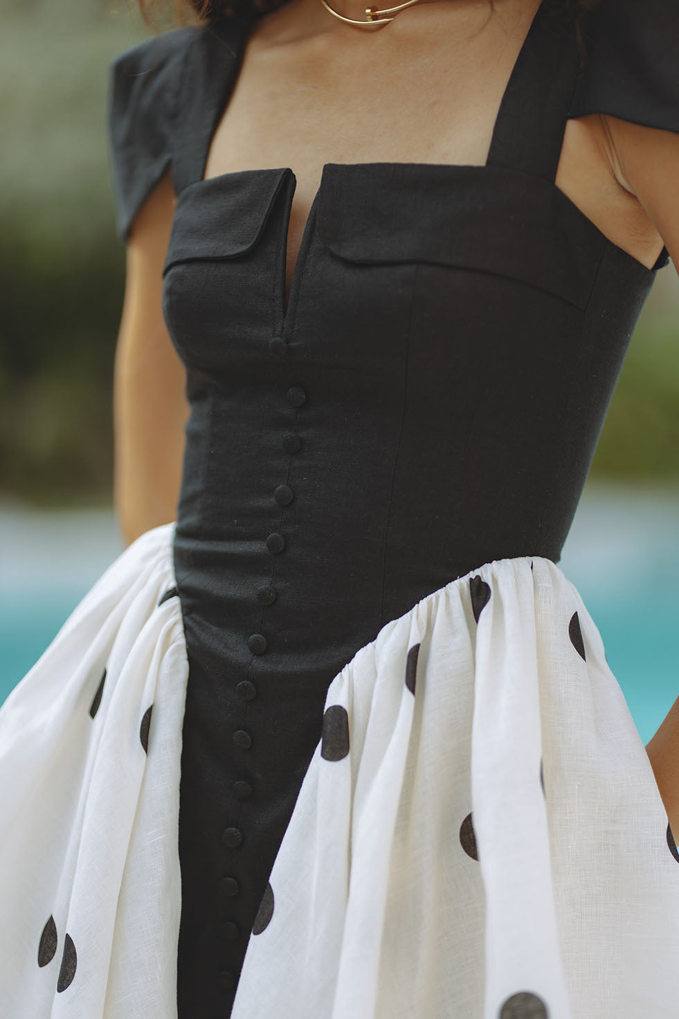 Playful yet sophisticated, the Antonella Linen Mini Dress in Polka is designed to turn heads. Featuring a structured black bodice with a square neckline, button detail, and chic cap sleeves, it flows into a flirty white polka-dot skirt. The lace-up back adds a bold, feminine touch while ensuring the perfect fit. Crafted in breathable linen, this mini dress is perfect for summer parties, date nights, or resort escapes.