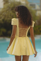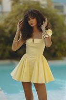 Sunshine in a silhouette — the Antonella Mini Dress radiates joy in striking canary yellow. Crafted from a breathable cotton blend with a touch of stretch, it features a sculpted sweetheart neckline, puff sleeves, and a flirty flared skirt. The lace-up back adds a romantic finish, perfect for summer soirées, weekend getaways, or any moment that deserves a little extra glow.