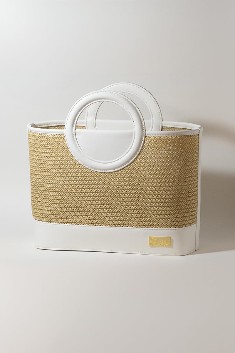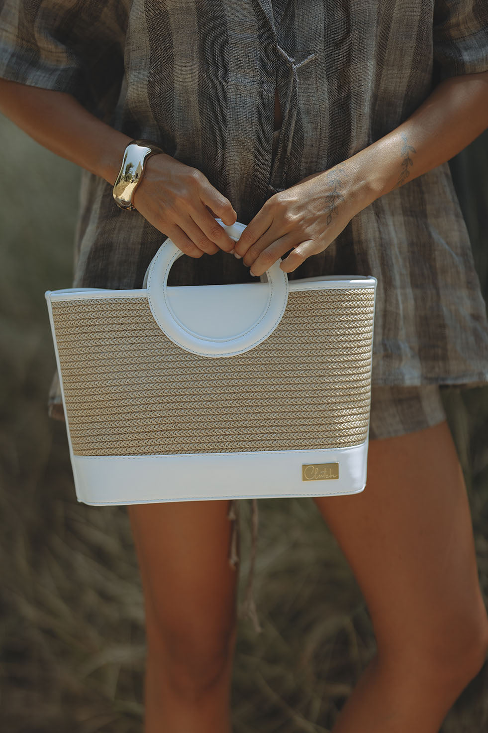 The Bella Bag in White is a celebration of understated luxury and ethical craftsmanship. This tote marries the natural texture of raffia with the smoothness of vegan leather, creating a stylish yet responsible accessory choice. Its circular handles add a touch of geometric sophistication, perfect for complementing any summer outfit. Whether it's an afternoon in the city or an evening at a resort, this bag brings a touch of elegance to sustainable fashion.