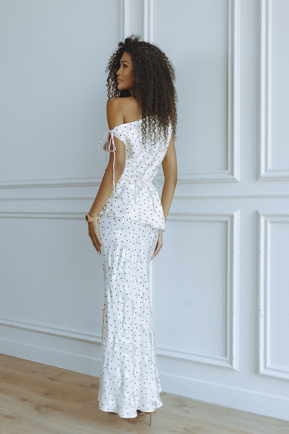 Elevate your wardrobe with the Darcy Viscose Top in Polka Jacquard. Designed in a lightweight viscose with a subtle jacquard finish, this one-shoulder style features delicate tie details and a softly draped silhouette. Playful polka dots bring a touch of charm, while the breathable fabric makes it perfect for warm days and effortless layering. Pair with the matching skirt for a polished set.