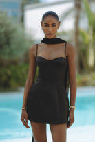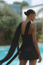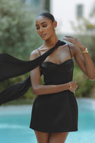 Cut to captivate, the ELARA hourglass dress sculpts the silhouette with a contoured bodice, delicate straps, and a flowing chiffon scarf that adds dramatic allure. Crafted from smooth, structured fabric, this little black dress blends elegance with edge. ELARA is your go-to for effortless sophistication and unforgettable entrances.