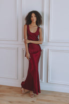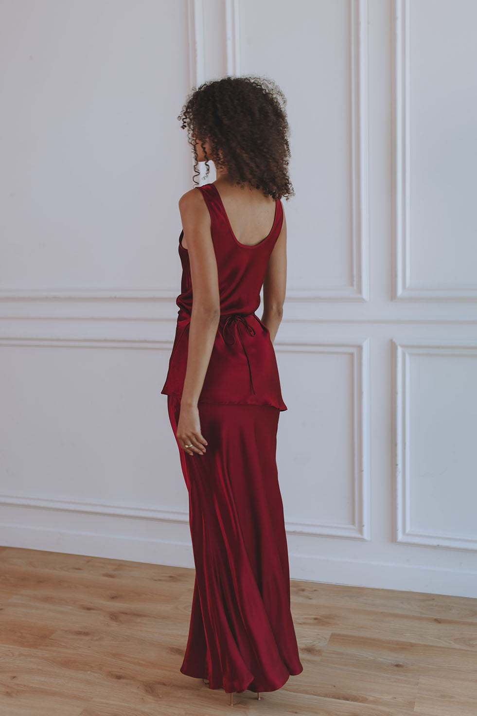 Effortlessly refined with a modern edge, the Eliza Satin Blouse is crafted from fluid, high-shine satin in a rich burgundy tone. Designed with a softly scooped neckline and elegant wide shoulder straps, this silhouette drapes beautifully over the body for a flattering yet relaxed fit. The softly flared hem creates subtle movement, while the adjustable tie-back detail allows the waist to be cinched for a customizable fit. Perfect for elevated evenings or chic daytime styling, this versatile blouse pairs seamlessly with the Eliza Satin Maxi Skirt for a flawless coordinated look.