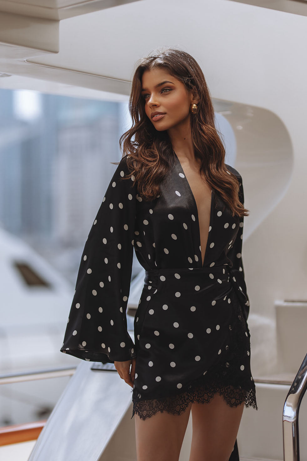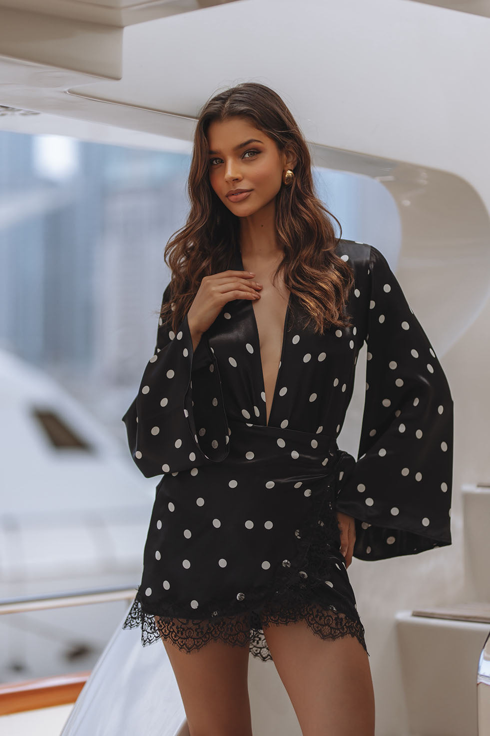 A striking satin set designed to make an entrance, the Frida Lace Satin Set blends timeless polka dots with a sleek, feminine silhouette. Featuring a plunging neckline, flared sleeves, and delicate black lace trimming at the hem, it feels both playful and polished.