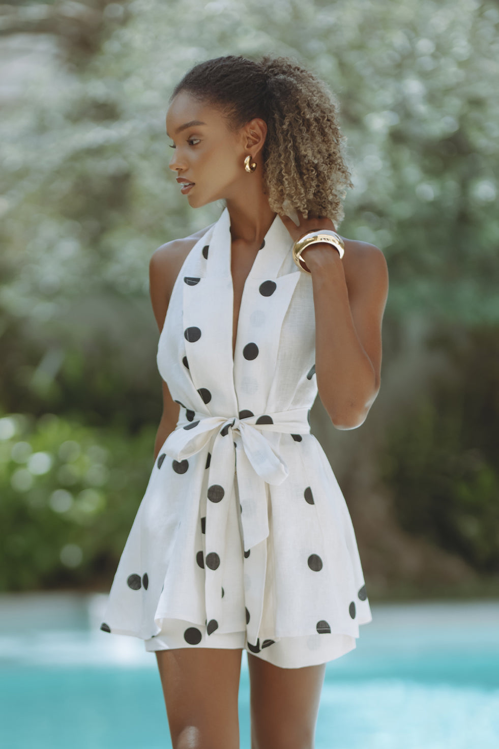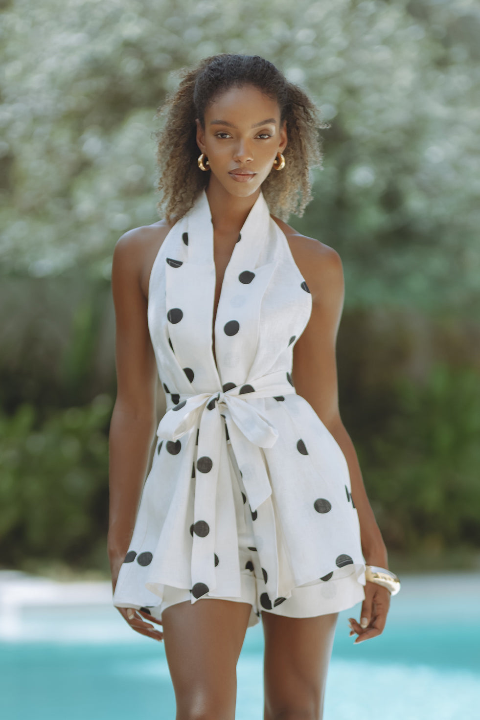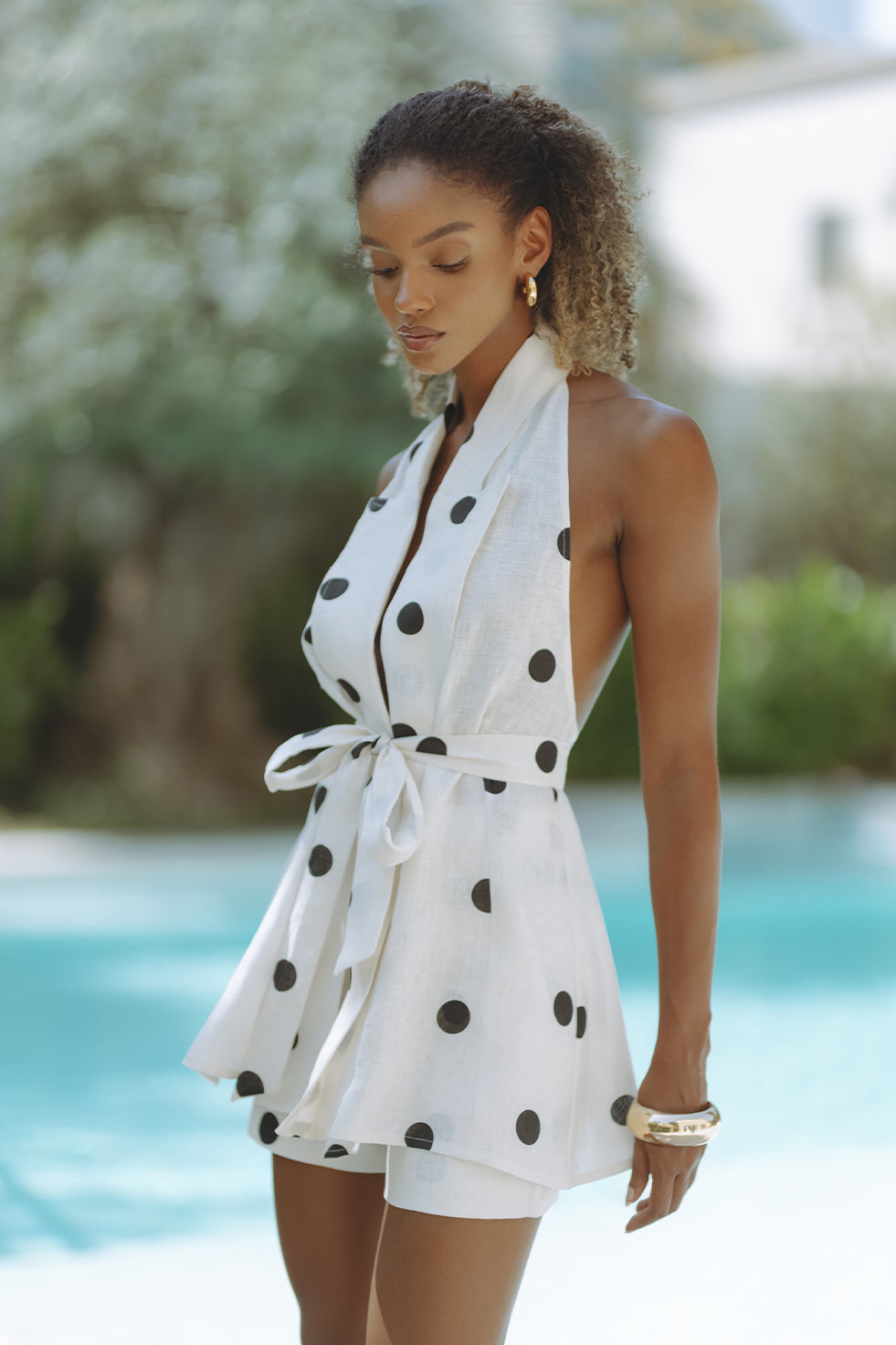 Breezy, bold, and effortlessly chic—the Gabby Linen Shorts are your go-to for playful summer flair. Crafted from breathable linen, they feature oversized black polka dots on a crisp Ivory base, a flattering high waist, and a statement belt with a sleek metal ring. Perfect for sun-soaked strolls or brunch by the coast, they pair beautifully with Gabby Halter Vest. Your vacation-ready wardrobe just got a stylish upgrade.
