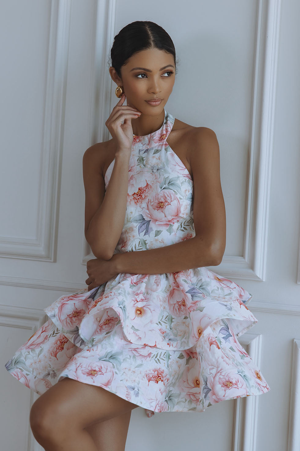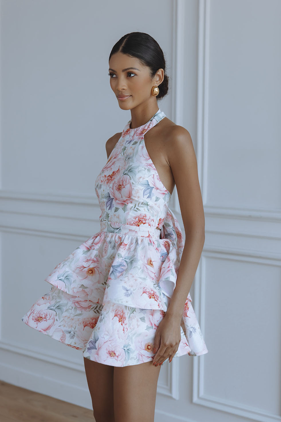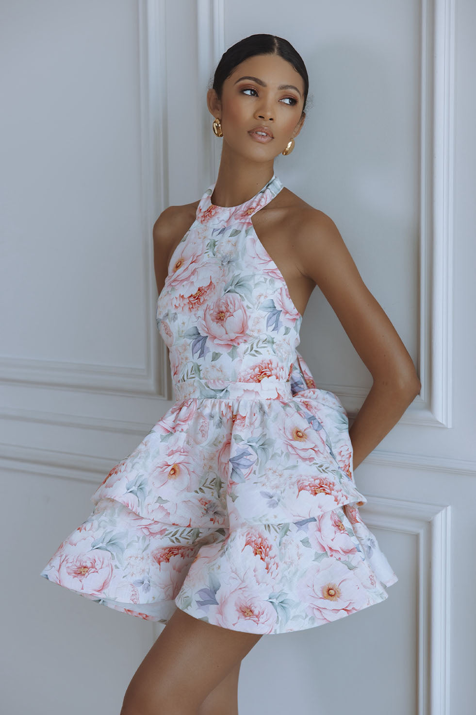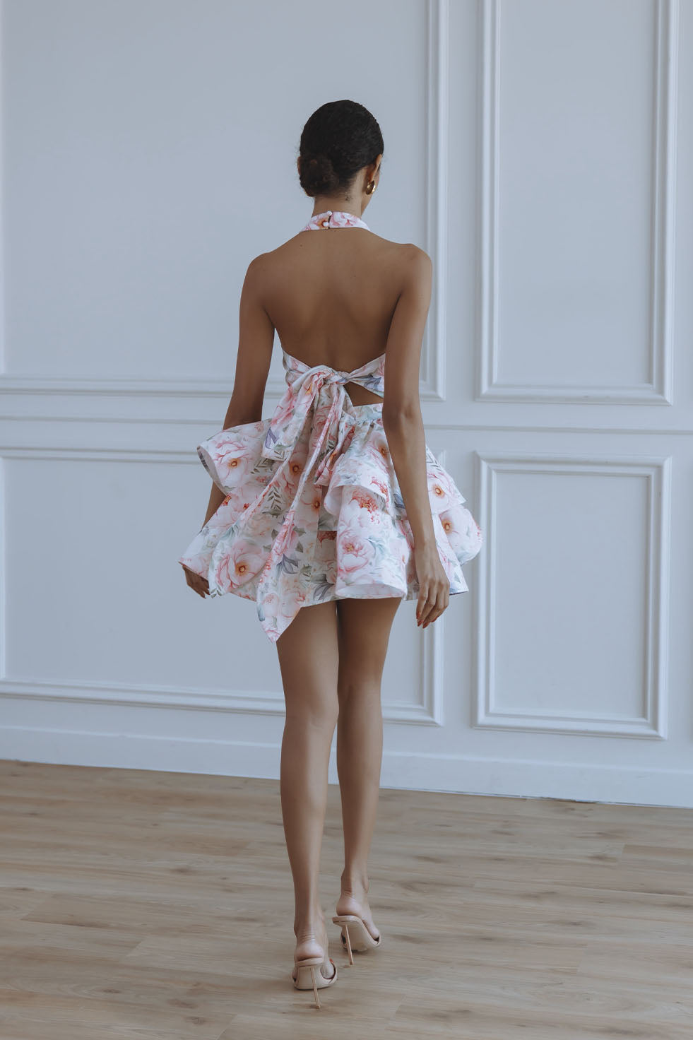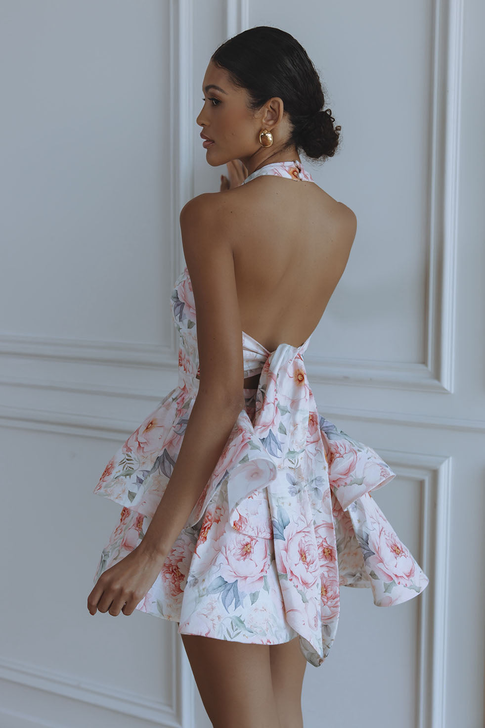 The Genie Linen Mini Dress is a statement in effortless femininity. Crafted from breathable linen and adorned with our soft Peony Poem floral, this mini features a flattering halter neckline and an open back finished with an oversized bow tie for a dramatic yet delicate touch.