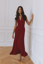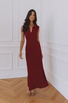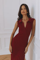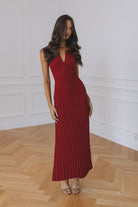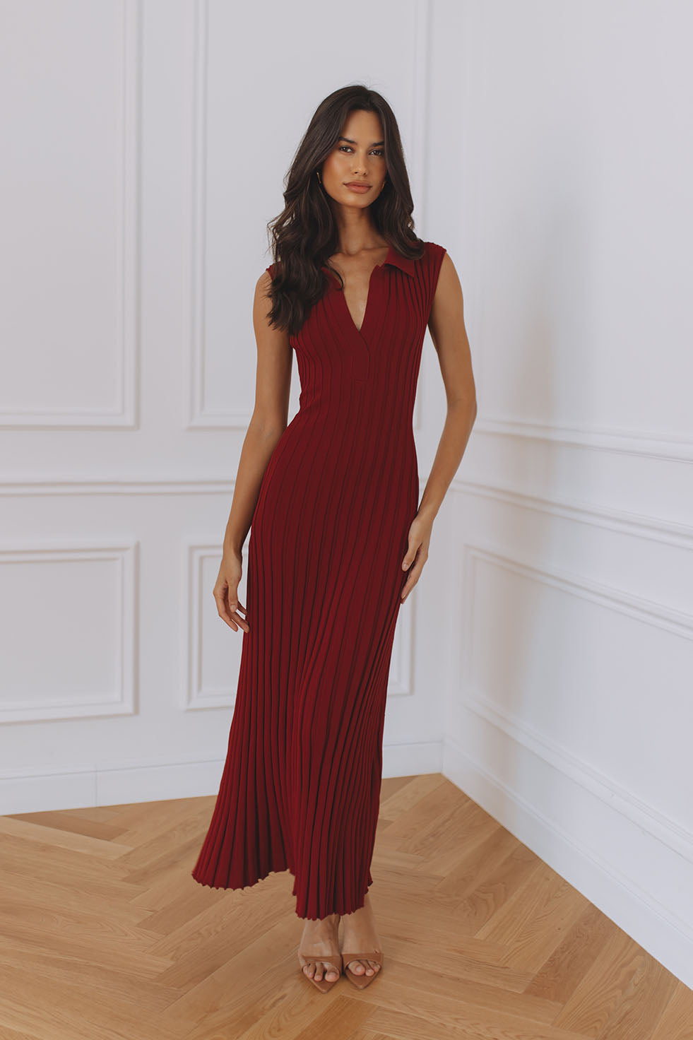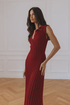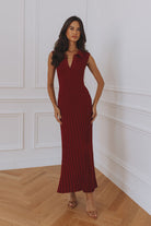 The LIVIA KNIT MAXI DRESS in Burgundy is a relaxed, ribbed knit silhouette crafted for elevated everyday dressing. Featuring a soft drape, a V-neckline with a sleek collar, and a self-tie at the back, the waist can be gently cinched for a personalised shape. This rich burgundy knit dress blends comfort, elegance, and versatility, perfect for both daytime outings and refined evening moments.