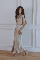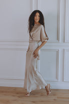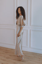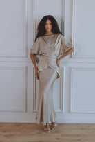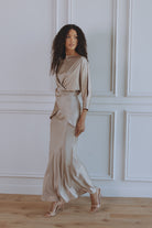 Refined and elegant, the Marcy Satin Blouse in Champagne is cut from lustrous satin that drapes beautifully over the body. The blouse features two front strings that tie at the back, creating a flattering wrap-style silhouette. Designed with elbow-length sleeves, the look is elevated by delicate cut-out detailing and finished with buttoned cuffs for a polished touch. With its bateau neckline and fluid structure, the Marcy Blouse transitions seamlessly from day to night.