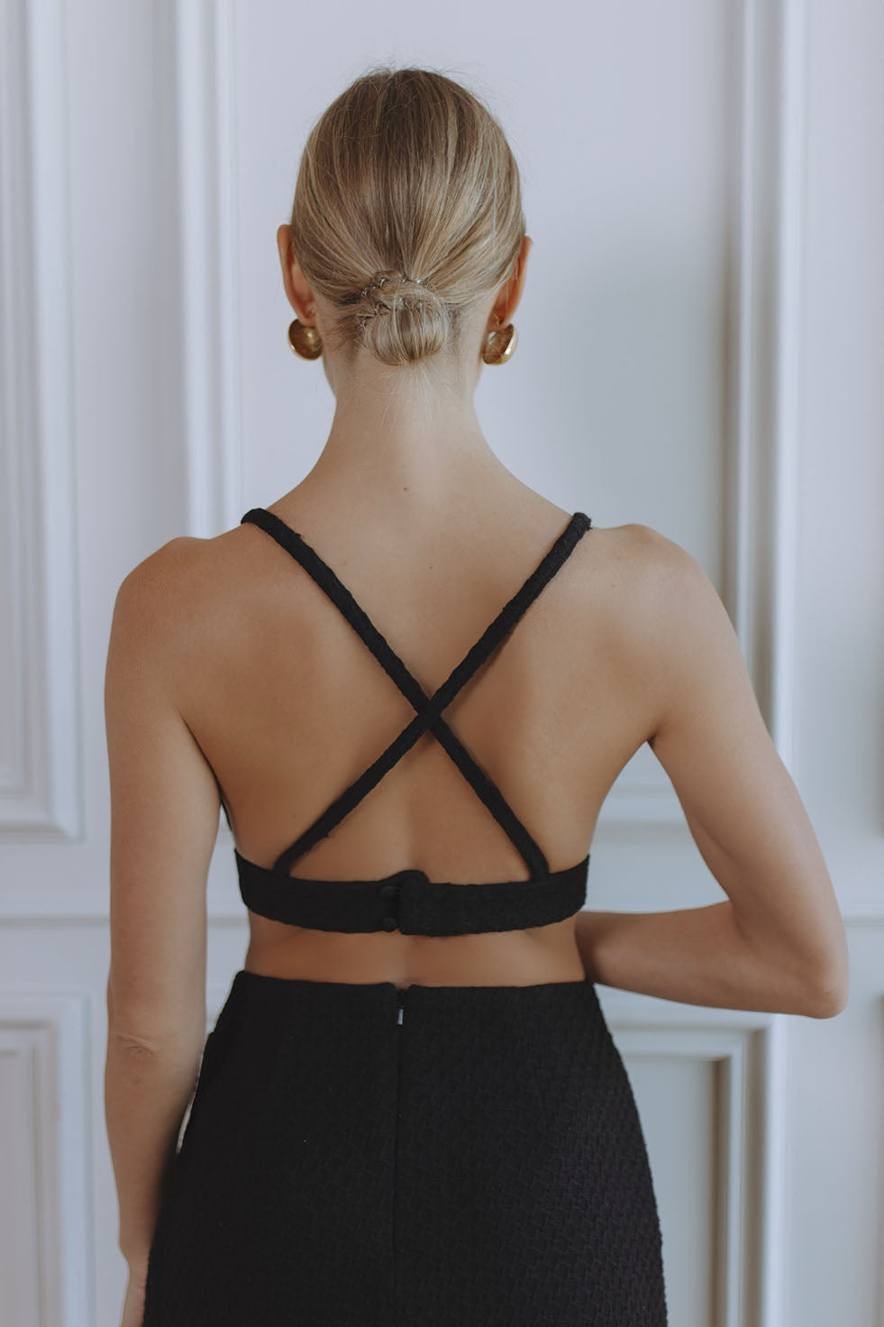 The Margaux Bouclé Bralette in black is the definition of sleek, modern elegance. Crafted from our signature textured bouclé, this structured bralette features a deep V neckline that enhances the silhouette while maintaining a refined, elevated look.